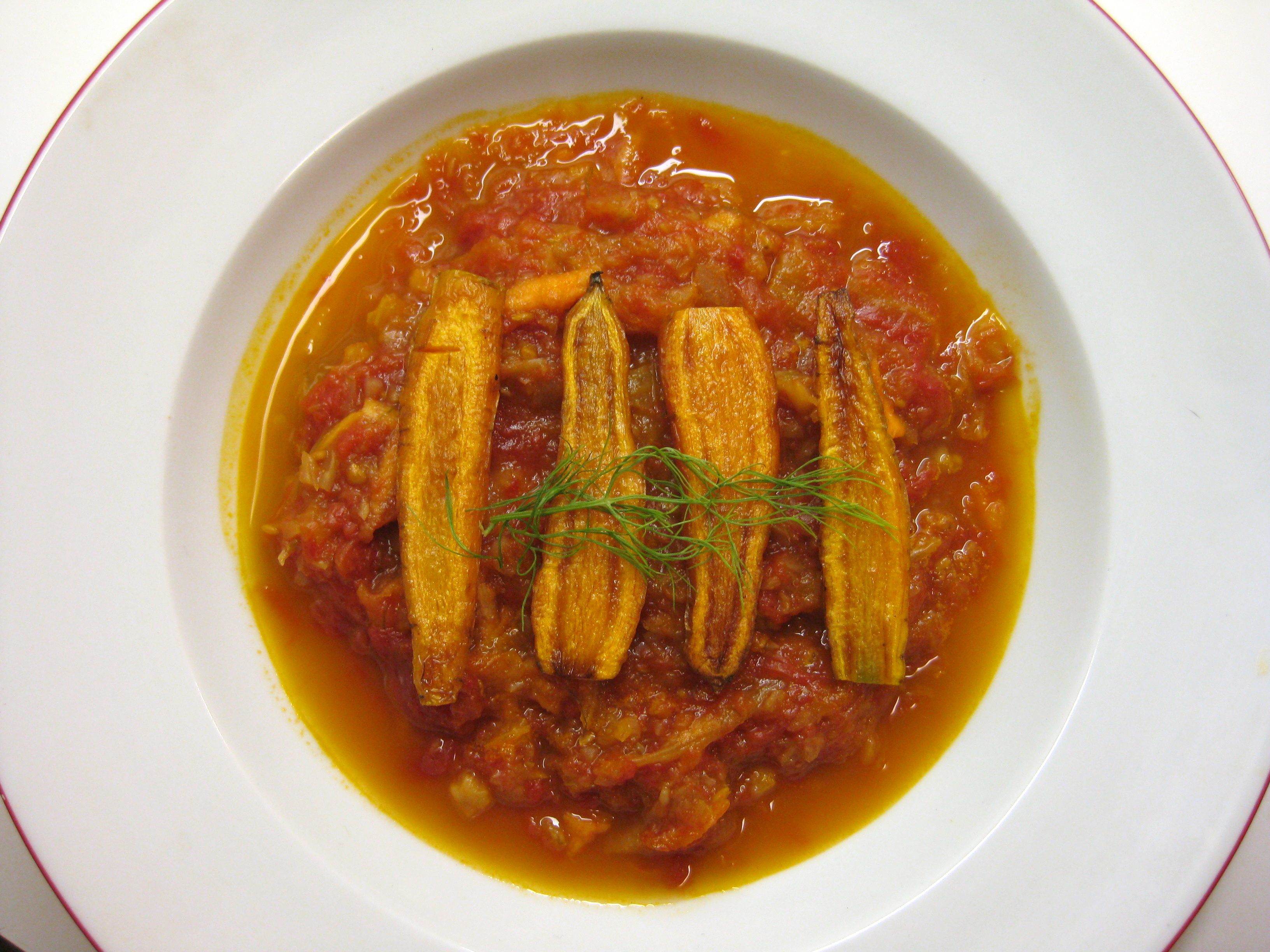 Simmer the fennel pieces in the broth until tender. Puree in a food processor, leaving the mixture slightly chunky, and return to the pan. Add the grated carrot and the tomato sauce. Simmer for about 20 minutes. Garnish with fennel fronds if you have them and roasted carrots.