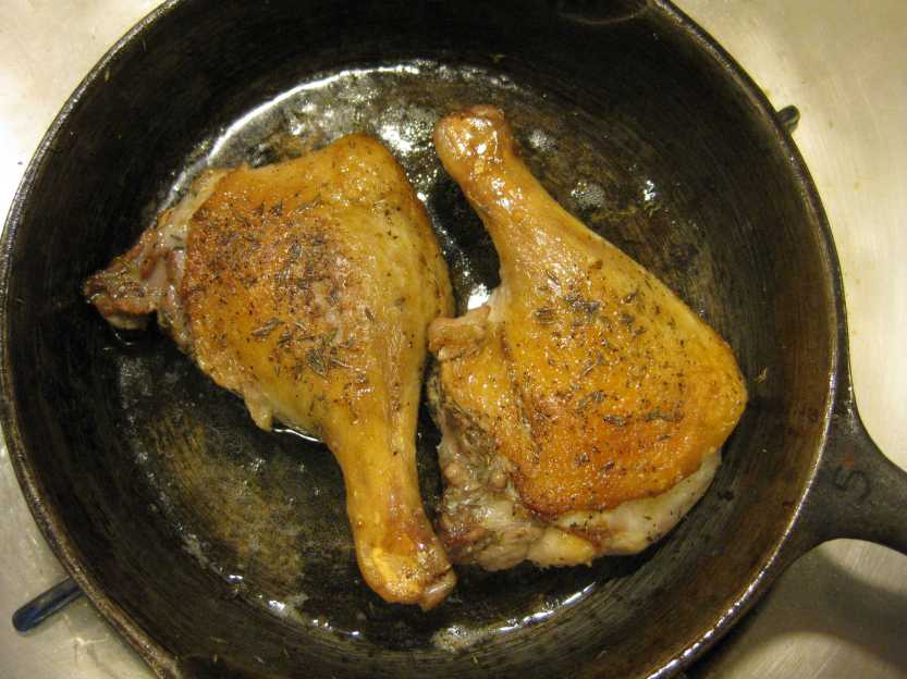 Preheat the oven to 325 degrees. Place the duck pieces skin side down in a small, heavy skillet cast iron that will hold the duck rather snugly. Cook on the stove over medium-low heat for about 20 minutes or until the fat has rendered about ¼ inch deep in the pan. Turn the duck over and let the bottom (meaty side) sear.