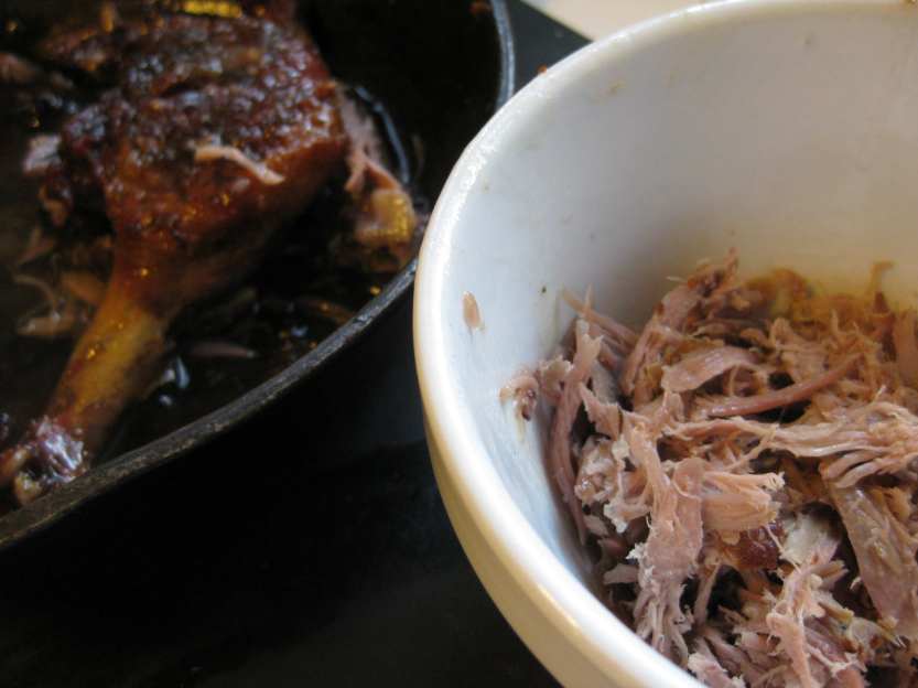 After cooking the duck legs for confit, let them cool to room temperature. Remove the skin and carefully shred the meat along the grain into strands. Add a little of the duck fat to moisten and season with salt and pepper. This can be served just as it is. Alternatively, you can season it with herbs such as thyme or a mixture called quatre epices (four spices) made of a pinch each of nutmeg, cloves, pepper and either cinnamon or ginger. Some people add a few drops of cognac. Serve as a spread with small pieces of sliced baguette or crackers. Some spicy fruit such as picked cherries or grapes is an especially good accompaniment.