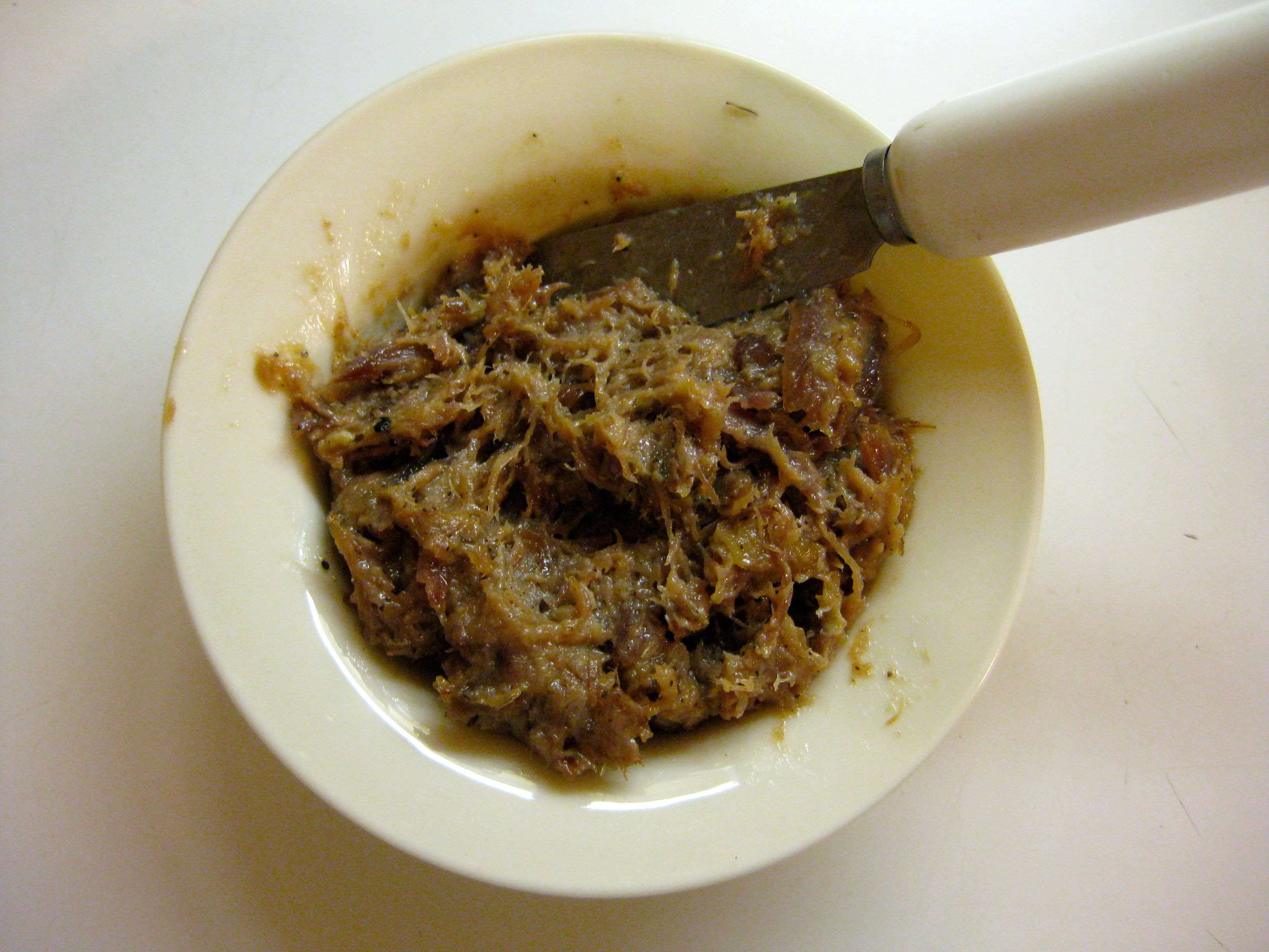 If eating the legs as confit, I would have removed the cover for the last of the 3-hour cooking time. Instead, I made rillettes, a pâté-like spread of shredded meat packed in a little crock, and didn’t need the outside to be crispy. The word rillettes is interesting in that its deeper root, beyond its association with pork belly, comes from words associated with boards or lath. That makes sense because they’re formed from strands of meat that are peeled along the grain, as you would see in a stalk of celery or a branch of wood.