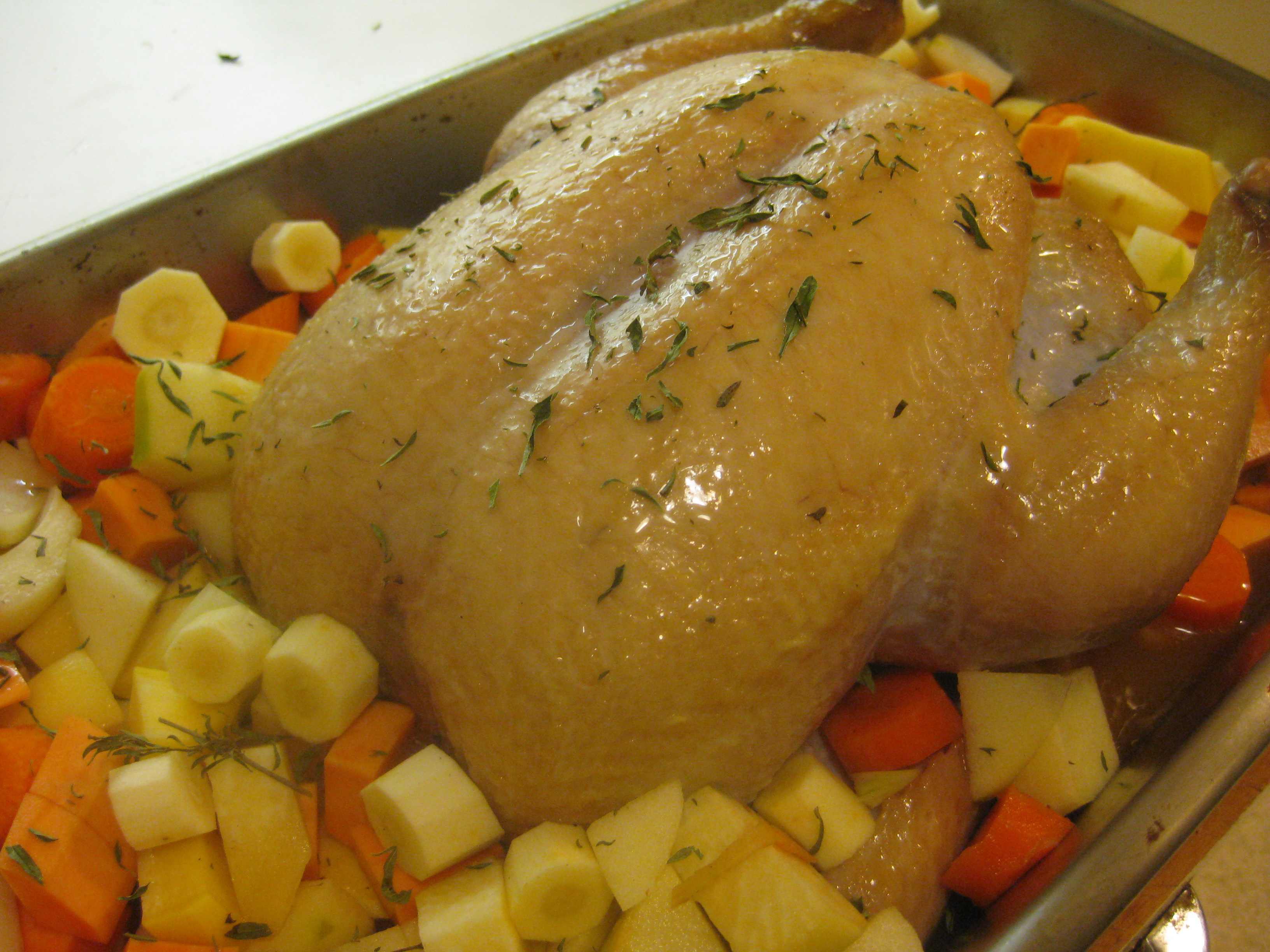 I’ve prepared this dish in past years, several times, and with only semi-satisfying results, so this gave me another chance for improvement. I actually didn’t have a finite plan when I started. However, while I was driving to Griggstown along snow-covered roads hugging the canal, and listening to NPR’s “A Splendid Table” on the radio, Lynne Rosetto Kaspar interviewed Molly Stevens about her new cookbook on roasting, and I said, “Ah ha!” Stevens described a daylong salt-curing process for roasting chicken, and I realized that this might be the trick that would keep my chicken from being braised or poached in the presence of so much liquid. I wanted a crisp-skinned, flavorful bird sitting atop a rich medley of roots, and that’s what we got.