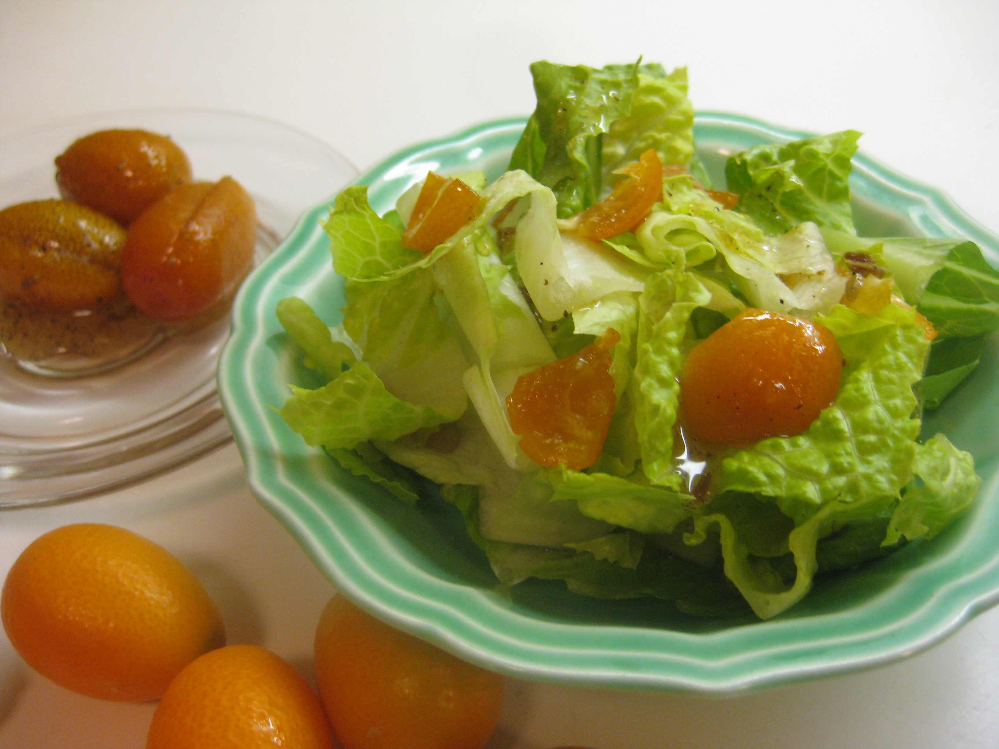 I serve them as a garnish for vegetables such as broccoli and roasted cauliflower, or a salad of bitter greens. My favorite is to use the liquid as a dressing for salad, since the skin of the kumquats yields its oils and you basically need nothing else. I have to admit though that a little toasted butternut seed oil is a pretty special addition.