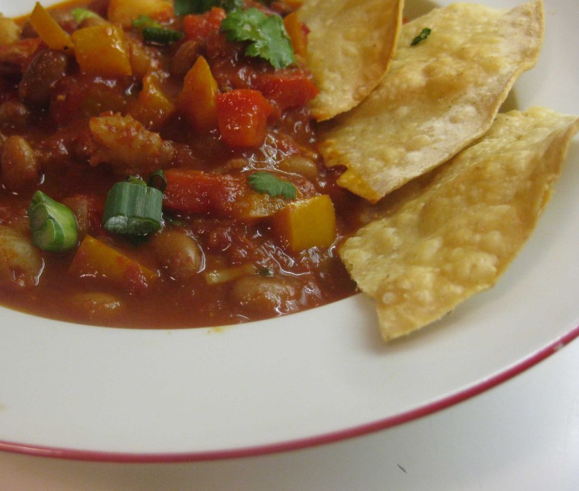 As an accompaniment, I “toasted” whole corn tortillas in the oven with a little olive oil and salt, and cut them into quarters for scooping up the delicious chili.