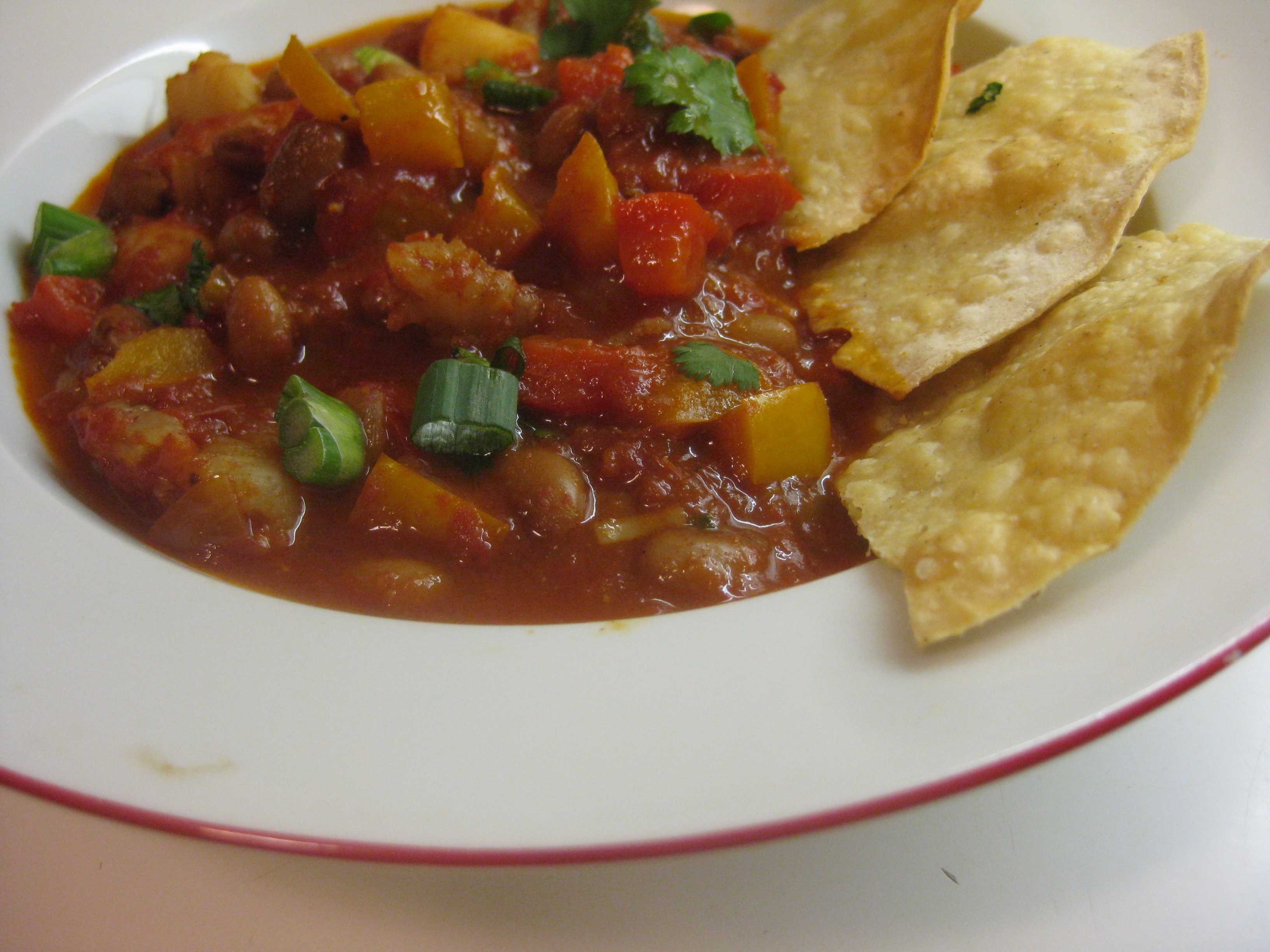 This is the season of the dried bean. Soups, stews, chilis and chowders, and even a few salads and sides have benefitted from the addition of these nutritious legumes. That’s how this seafood chili originated. I had cooked the last of Rancho Gordo Yellow Indian Woman beans that we brought back from the famed San Francisco Farmers Market, and I thought that their color, size and flavor would complement a seafood chili. I rescued organic yellow and red peppers from the local market’s markdown bin and used up the odd amounts of stocks and broths – including the bean broth of course – as the liquid. The chili base can be made ahead, which improves its flavor. The seafood goes in at the last minute.