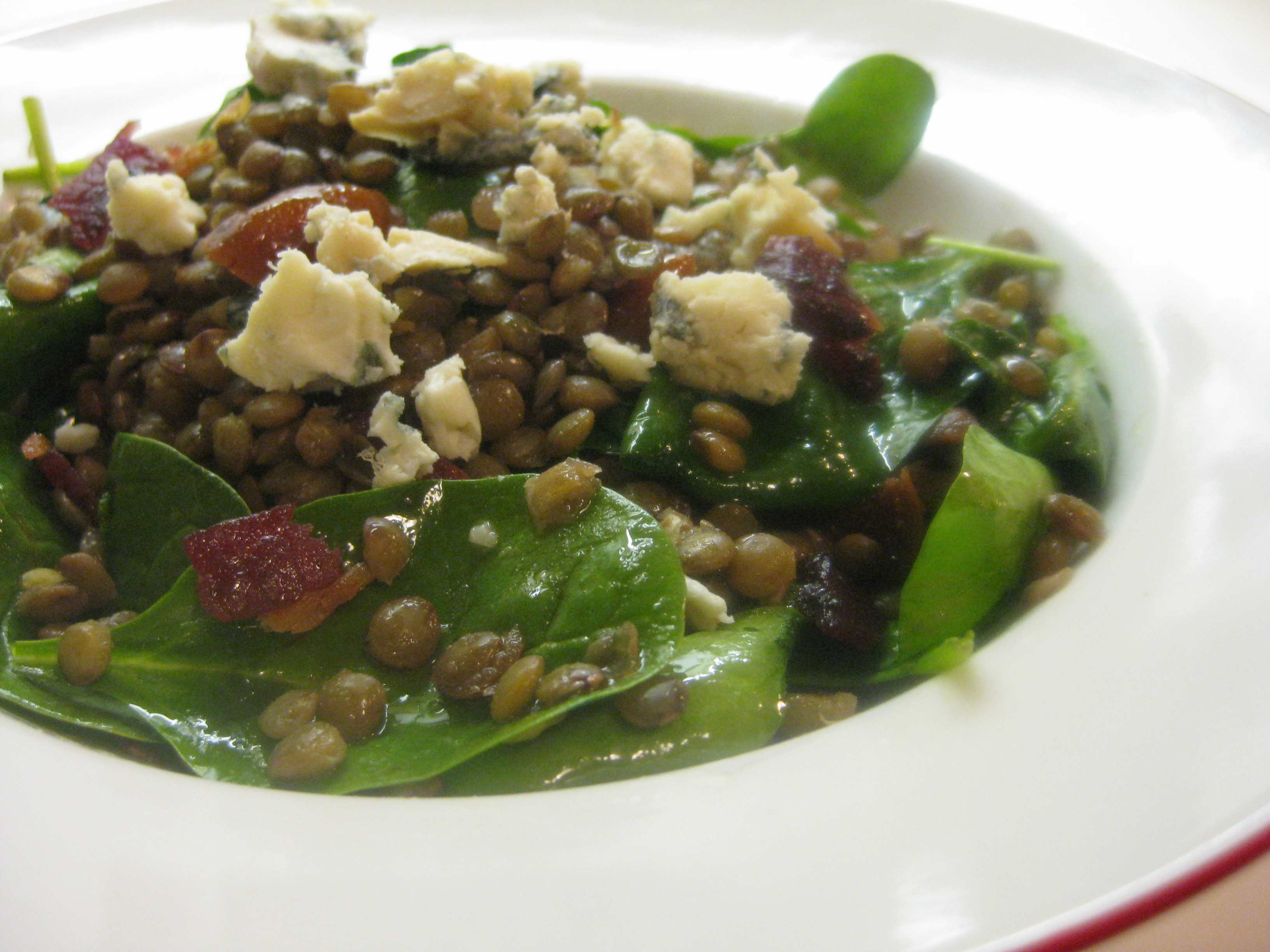 When ready to serve, taste the lentils and adjust the seasonings with a little salt (remember that the bacon and cheese will add salt) and a splash of red wine vinegar. Cut the bacon and cheese into pieces and add to the lentils, along with freshly ground black pepper. Add a handful of spinach and toss. If too dry, add a little oil and vinegar or cherry juice.