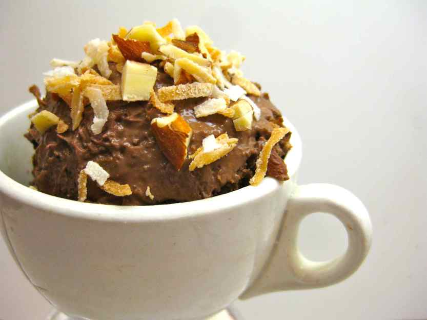This is a very rich sorbet, made with a combination of semisweet and bittersweet chocolate in a coconut milk bath. I added shredded coconut and chopped almonds, both toasted until light brown. This was so decadent that I could have convinced you that it contained heavy cream to the hilt. I did use full fat coconut milk, whereas I normally use “lite.” I also used very good quality chocolate. Even before I froze this, it was pudding-like in consistency.