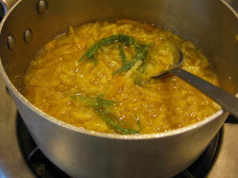 Measure the lemon mixture and add sugar in a ratio of 3:4, meaning ¾ cup sugar to 1 cup of fruit. Pour lemon mixture back into the pot, add the pouch of seeds and a large sprig or two of tarragon, and cook at a medium boil for about 25 minutes, stirring frequently to prevent a scorched bottom. Remove the seed pouch before the marmalade finishes, so that it doesn’t get too sticky, and discard. The marmalade is done when a droplet added to the frozen plate doesn’t run. I sometimes use a candy thermometer, which shows a gel point at 221 degrees Fahrenheit, but I find that cooking the marmalade that long makes it denser than I like. In any case, watch the pot carefully and stir the mix as progress accelerates toward the end.