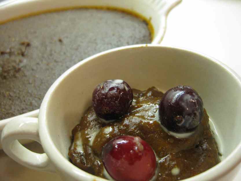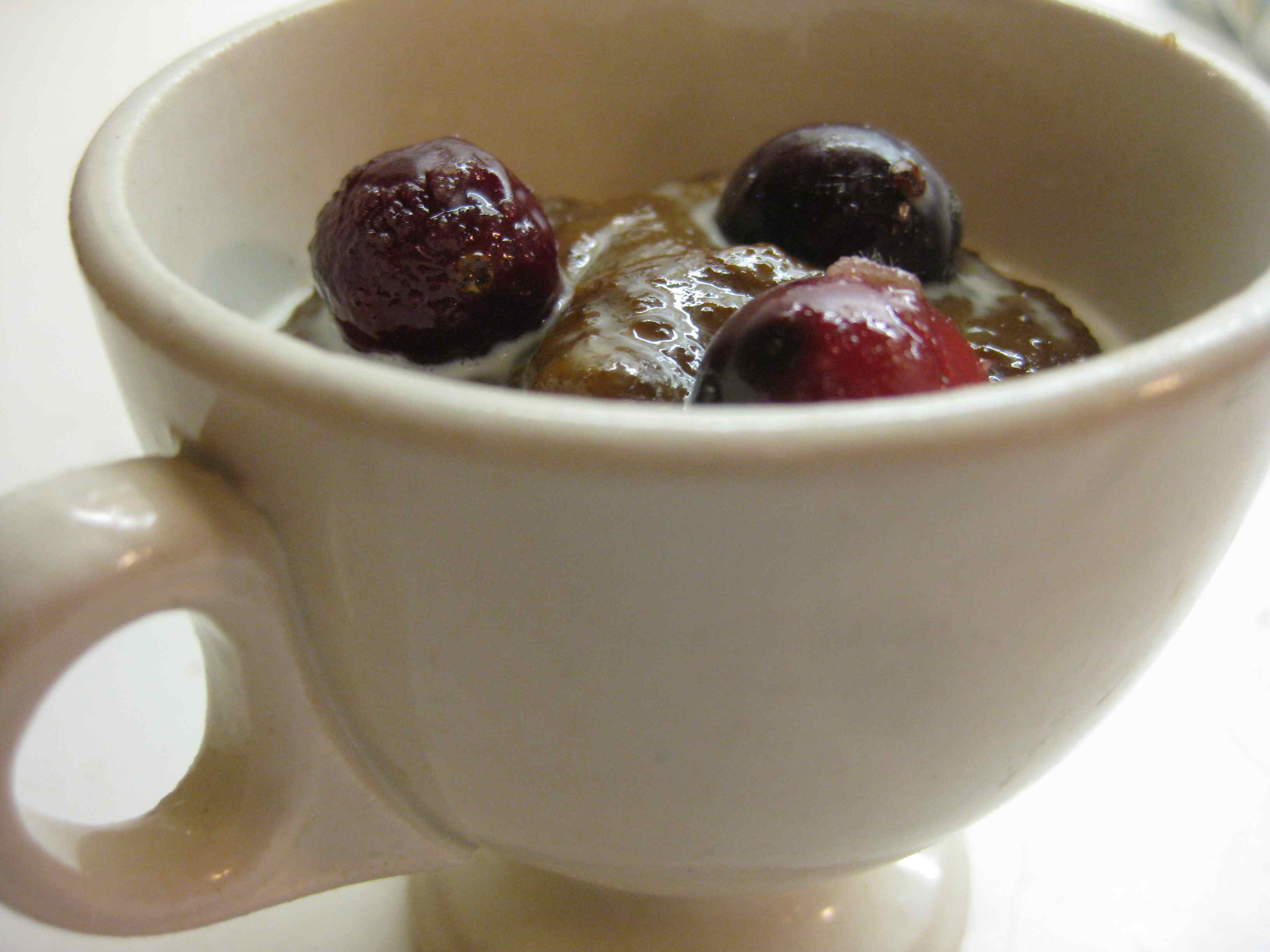 The recipe didn’t appear to have the right proportion of cornmeal to milk and after cooking it halfway, I changed course and doubled the cornmeal to reach perfection (which is now reflected in my recipe). I’m sure this is because cornmeal comes in all kinds of grinds and absorption rates. I also changed the amount (less) and type of sugar, opting for local maple syrup and molasses. I topped the finished pudding with a little heavy cream and the last of the candied cranberries that I made for the Dark Days Dessert Challenge, though poached or baked apples would have been good too.