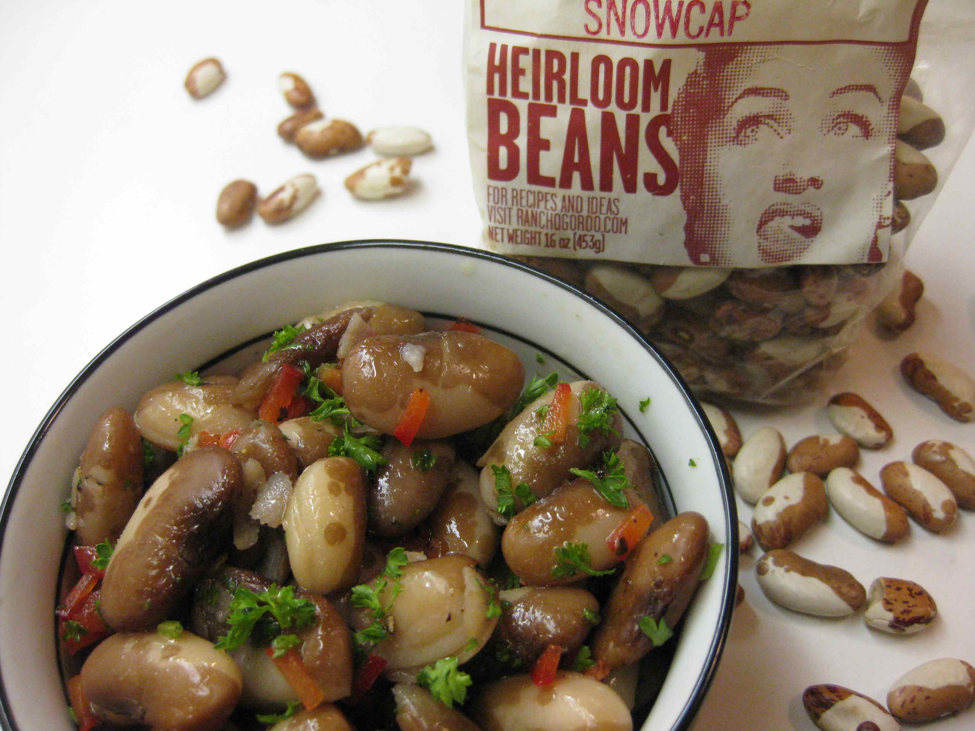 Those big oval creamy lupini beans from the so-called olive bar at grocery stores are deliciously addictive eaten as part of an antipasto or tossed into a salad. I haven’t found a good or reasonably priced source for them, and I hear they need quite a lot of preparation. Those beans are native to Italy and are very high in protein, similar to soybeans. I finally found a great alternative: dried snowcap beans. Snowcap beans are beautiful, rusty orange and white.