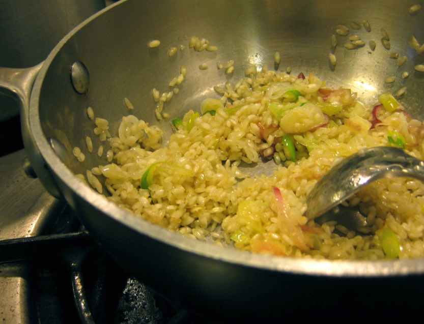 Ah April, when the asparagus stalks emerge all spindly from the bare ground and plump violet spring onions are bunched for sale at the market. One of our local farms has a pick-your-own asparagus field, which I visit on my way back from the farmers’ market on Saturday. It’s rejuvenating to know that our local earth is starting to produce our daily meals once again. And yet the weather, ever so fickle (climate change?) vacillates between a dry 80 degrees and below 50 in a chilling rain. That’s when spring risotto comes in. It perfectly balances our yen for the freshest ingredients with the comfort of a warm and unctuous, satisfying dish.
