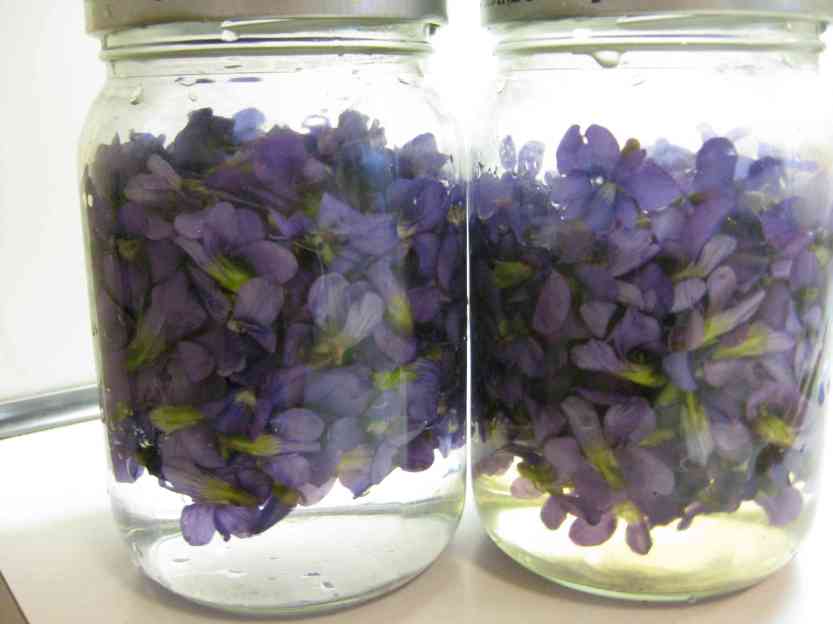 After harvesting the flowers at midday from a shady spot (when they’re most aromatic), I shook them in a colander to loosen any dust. I mixed them with the vinegar in a 3:1 proportion (three parts vinegar to one part violet leaves) and placed them into very clean jars that had been doused with boiling water. Tightly capped, the violet mixture was set aside for 10 days, though I turned the jar upside down then right side up every day. The liquid started out clear and the violets blue and by the end, the violets had released all of their color into the liquid. I carefully decanted the vinegar into bottles that I am storing in the refrigerator, discarding the violet flowers.