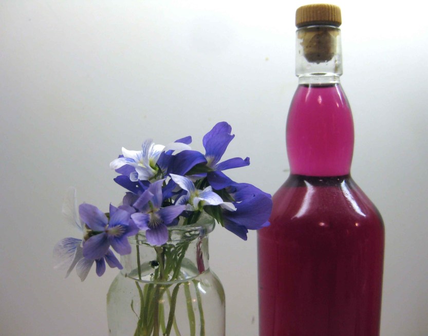 Those enchanting wood violets that appear in the spring make victims of proper lawns. Our lawn, already tainted by a towering black walnut tree, is anything but proper, and so it has become a field of mostly edible “weeds.” No pesticides or herbicides here. After making a delicious batch of violet jelly – the one that went viral on the Internet last spring — I decided to take the experiment a step further and made two types of violet vinegar. Two types because I wasn’t sure about the base. I used white vinegar for one and champagne vinegar for the other, on the theory that anything more flavorful would mask the floral tones.