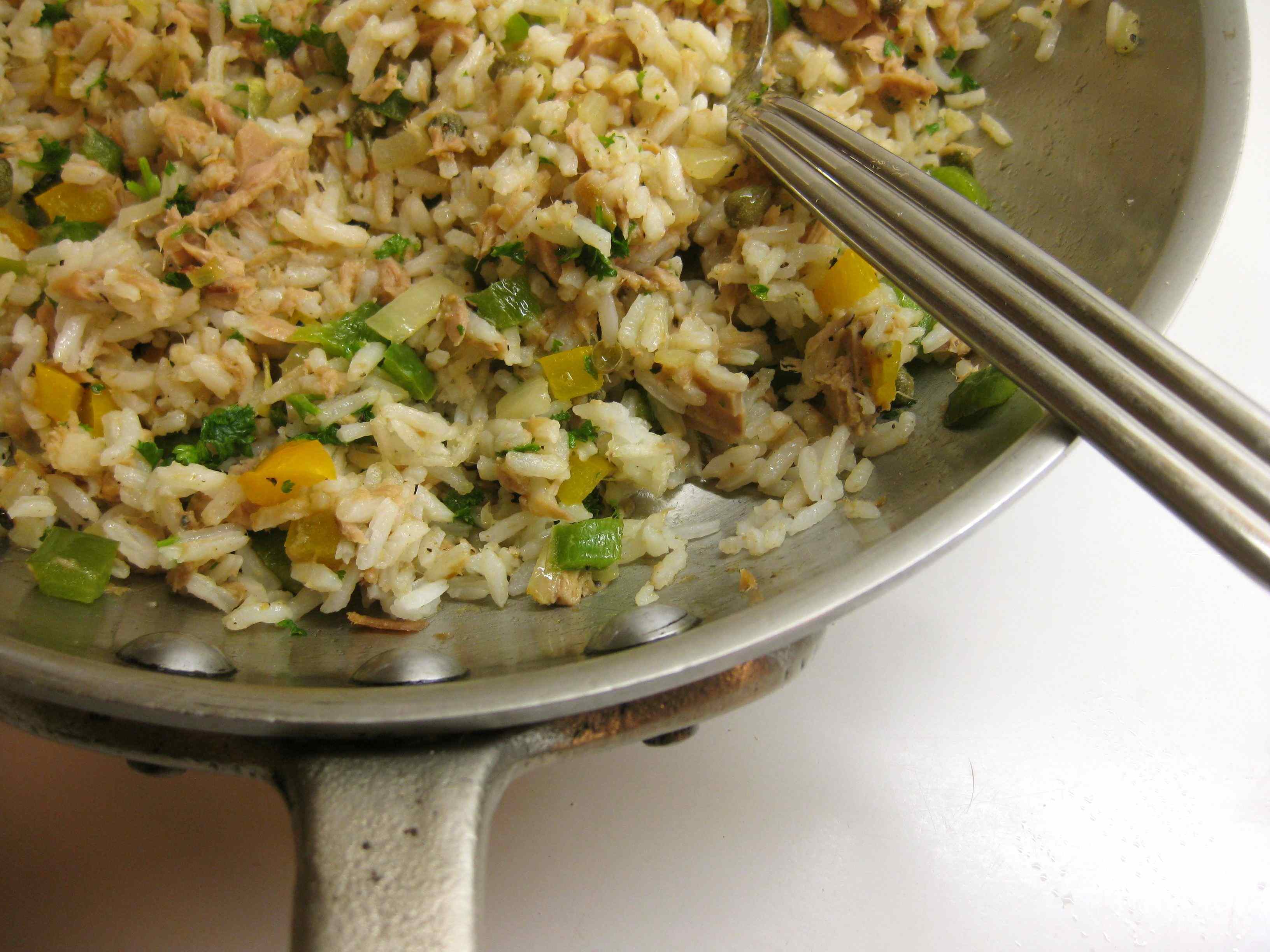 Saute the diced onion and peppers in a small amount of olive oil until tender but still slightly crisp. Combine with the rice. Add tuna, capers, anchovies if using, parsley and freshly ground pepper. Add additional olive oil to bind the ingredients.