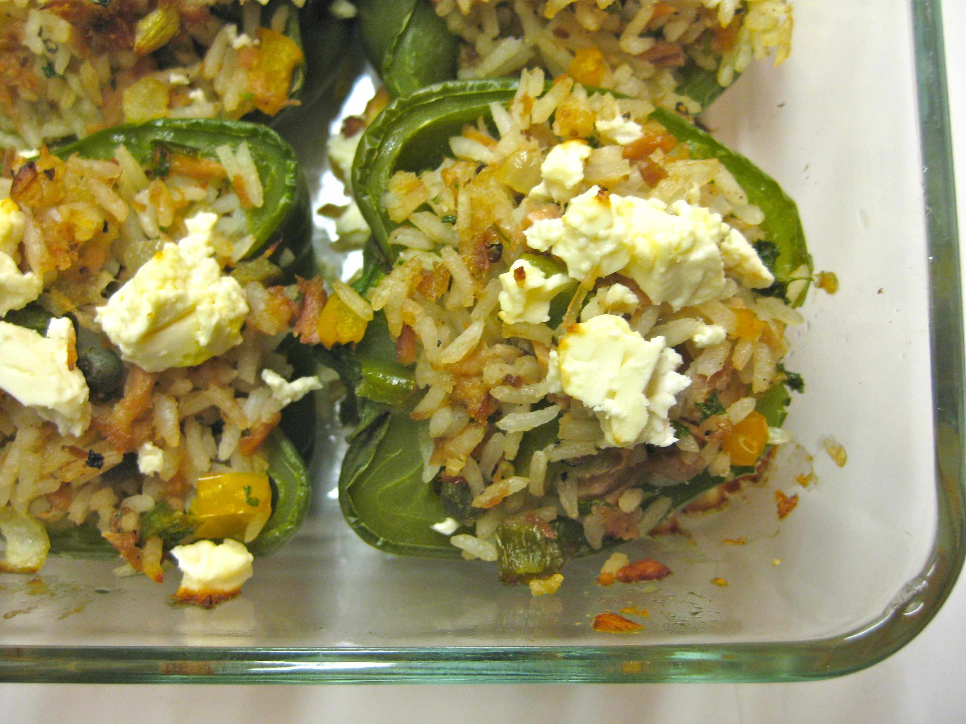 Meanwhile, back here in springtime, I’ve had a hankering for stuffed peppers. I often rescue some good ones from the markdown bin at our local organic produce store. Many people don’t like stuffed peppers – or green peppers at all. Too grassy. Personally, I find them a great convenience as a vehicle for all kinds of mixtures, and a great way to use up stray ingredients or stretch the ones you have on hand. What brought this combination of peppers, tuna and rice to mind was a craving for a certain Italian antipasto of roasted green peppers and anchovies. There was something about the memory of those salty tidbits that made me think that a tuna-rice combination would make a good filling for the peppers.