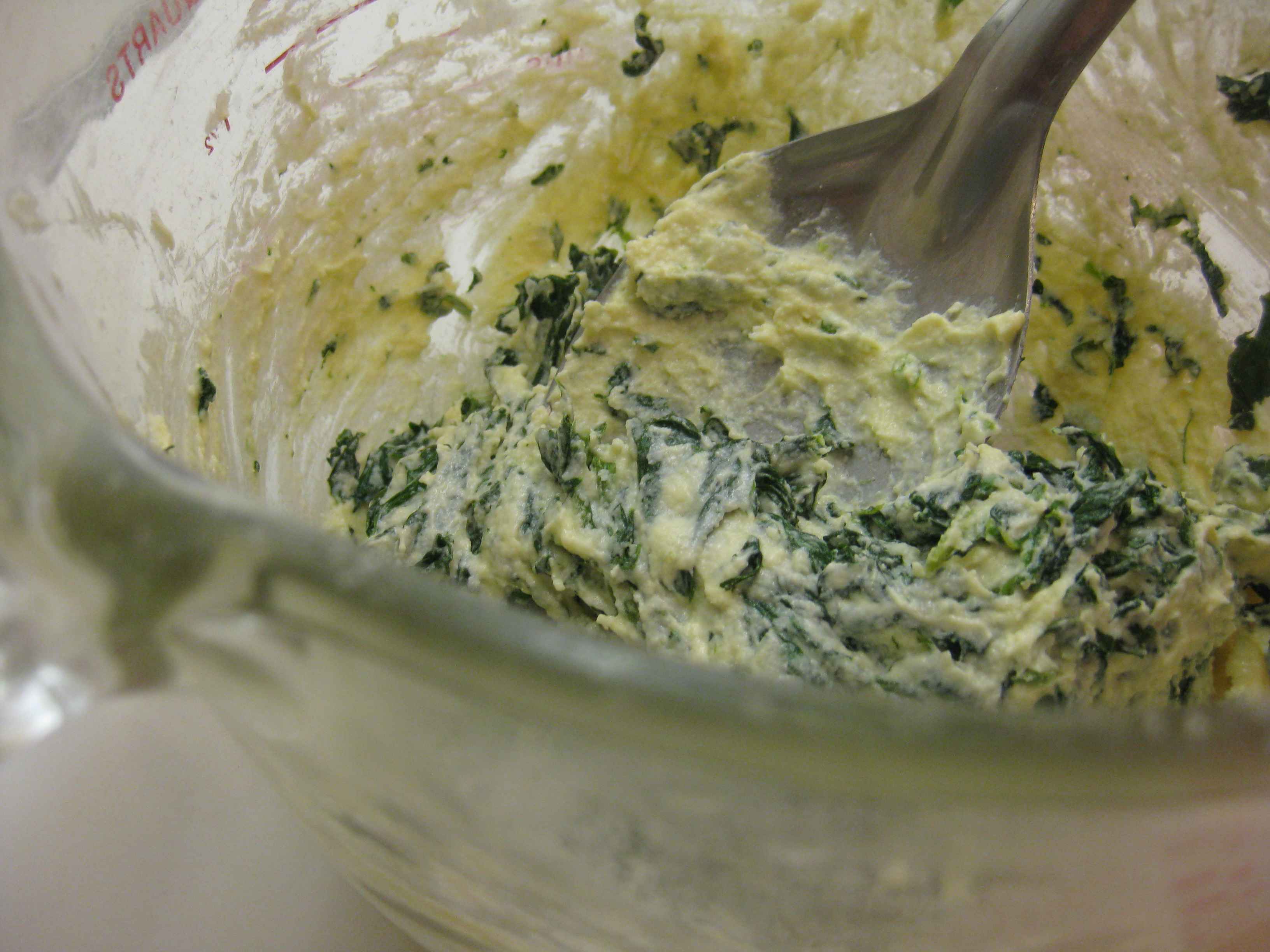 Prepare the spinach. Wash the spinach well in abundant water to remove any sand or grit. Remove the stems. Wilt it in a large pan over medium-high heat, in the water that clings to the leaves. Remove the drain and cool. Squeeze out as much liquid as possible and chop finely.