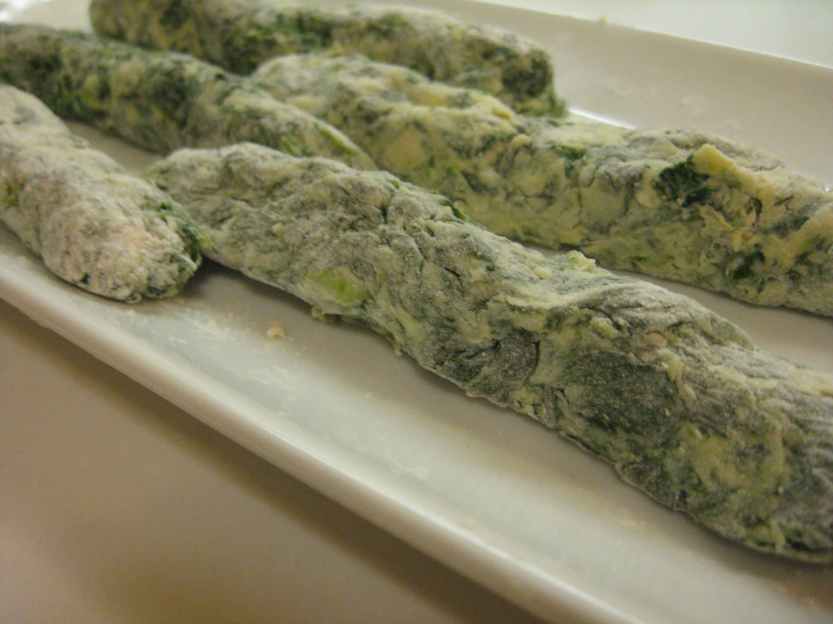 Lightly beat the egg yolks and add the grated cheese and ricotta, mixing well. Add the flour and the spinach-herb mixture, combining well. Roll into logs about ½-3/4 inch thick, coating with flour as you go. Place the gnocchi on a plate in the refrigerator to firm up for at least 30 minutes.