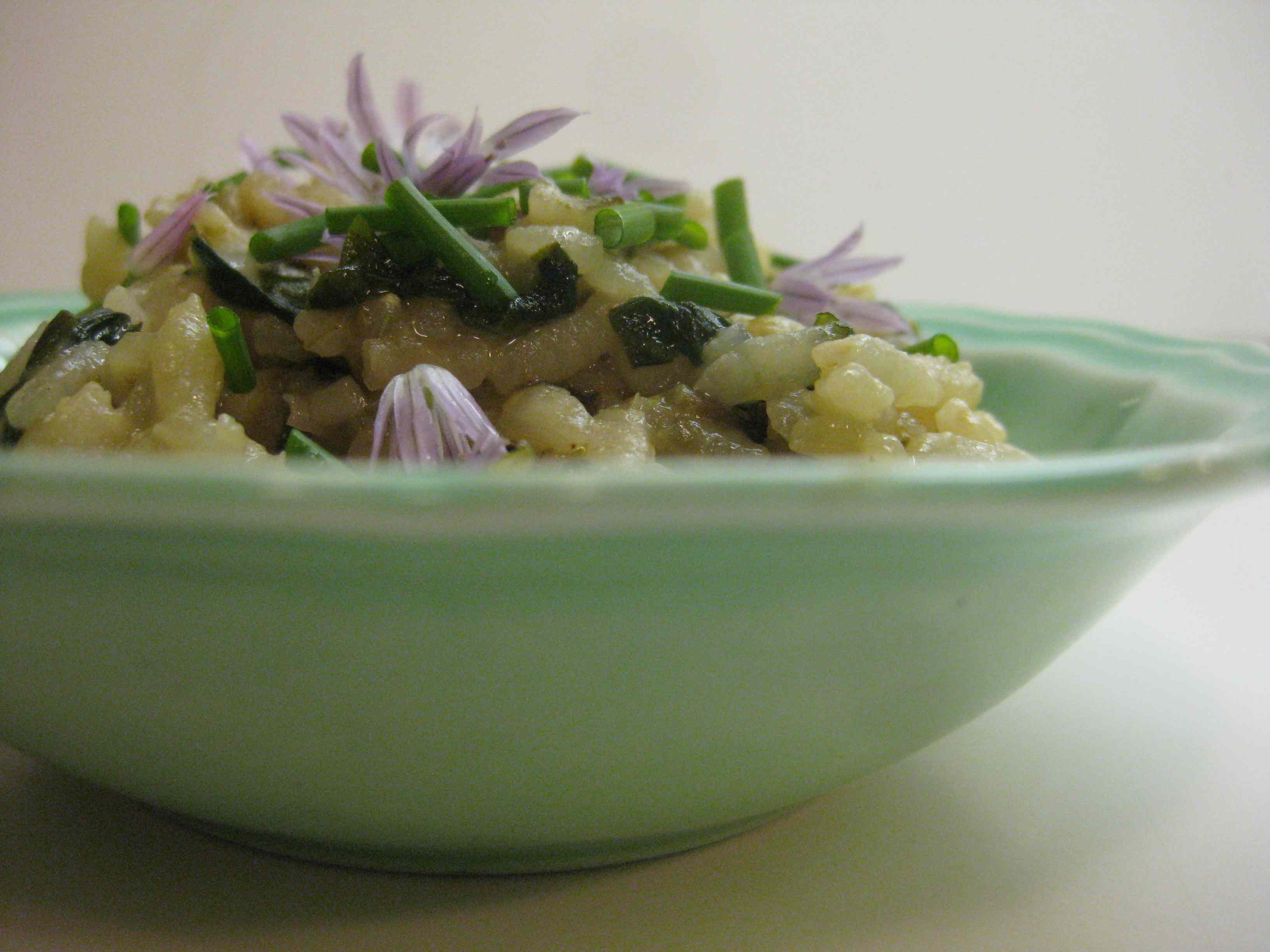 Saute the root ends and stalks slowly in the oil and/or butter. Add the rice and stir to coat. Add the wine and stir until the wine is absorbed. Add 1/3 cup of stock, turn the heat to medium low or low (so it just simmers) and stir until the liquid is absorbed. When the liquid is absorbed, add another 1/3 cup of stock, wait until it’s absorbed, stirring occasionally, and then repeat until the rice is tender but still al dente. This process will take about 20-25 minutes. Every 5 minutes, add a portion of the ramp leaves. When the risotto is finished, add the grated cheese, season to taste with salt and a pinch or so of lemon zest if you choose. Garnish with snipped chives and tufts from a chive flower. Serves 4.