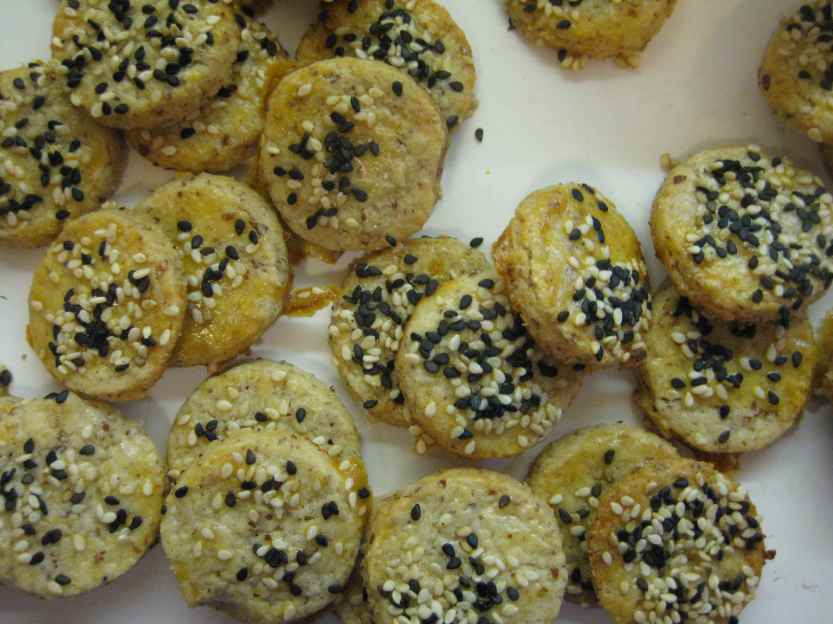A note about the recipes, which I had to adjust. Since I made the chocolate first and it turned out perfect — rich chocolate shortbread with a kick from cayenne pepper and flaky salt on top — I assumed that the other two recipes would be perfect. Not so, but I made an adjustment that worked just fine. The chocolate version was a typical recipe with butter eggs, sugar, flour chocolate, seasoning. The rosemary-almond was delicious and crumbly, which I attribute to the fact that my egg yolks – from local free-range chickens – were on the small side. However, the sesame cookies, which are shortbreads – meaning no eggs – were made with a combination of almond meal and all-purpose flour, which can vary in absorption rate. While I had forced the rosemary-almond cookies to coalesce by kneading it — most of the cookies held together – I simply couldn’t get the dough for the sesame cookies to hold together, so I added a beaten egg to the dough in addition to brushing the cookies with a beaten egg to “glue” on the seeds. The results were great.
