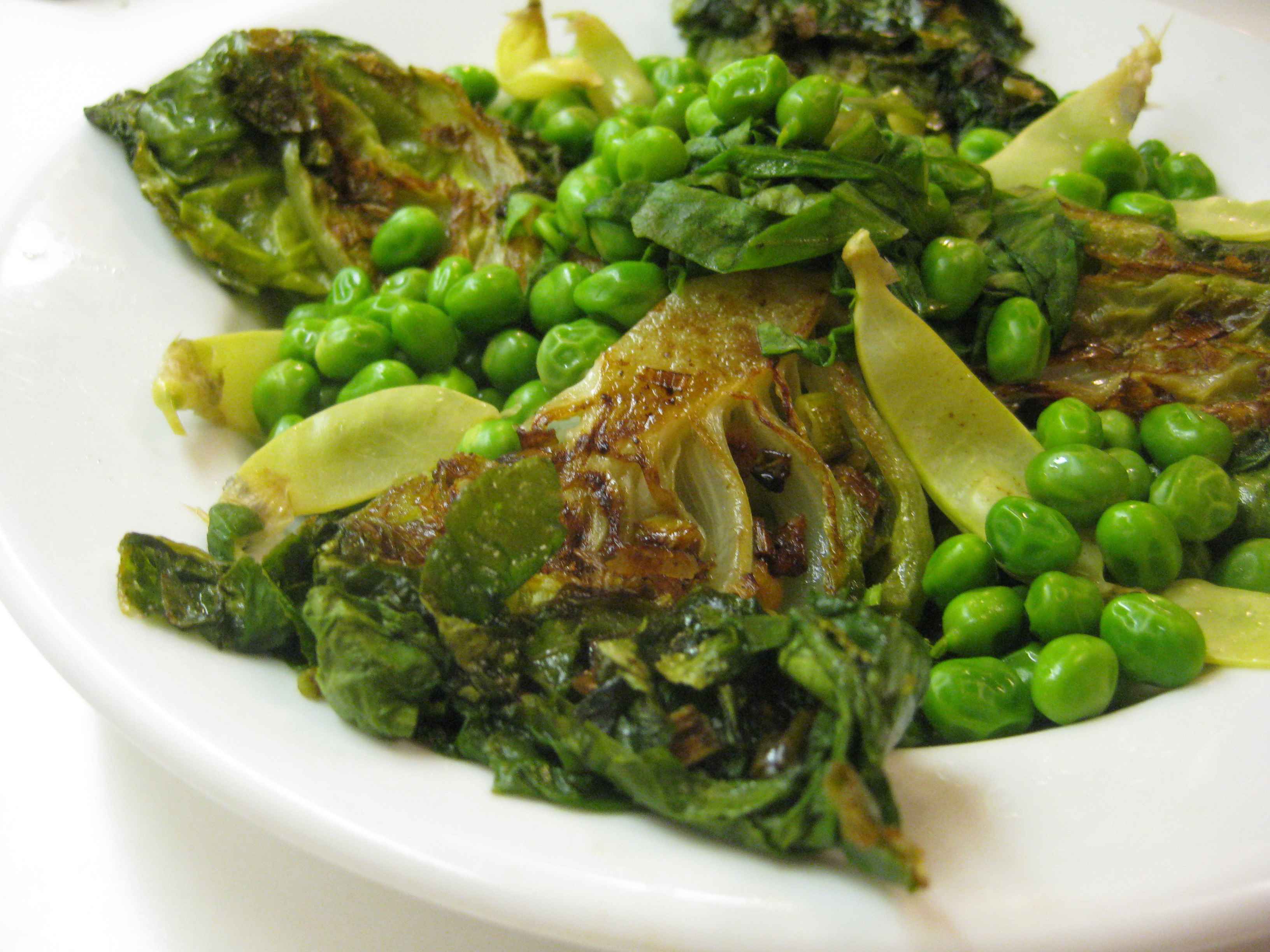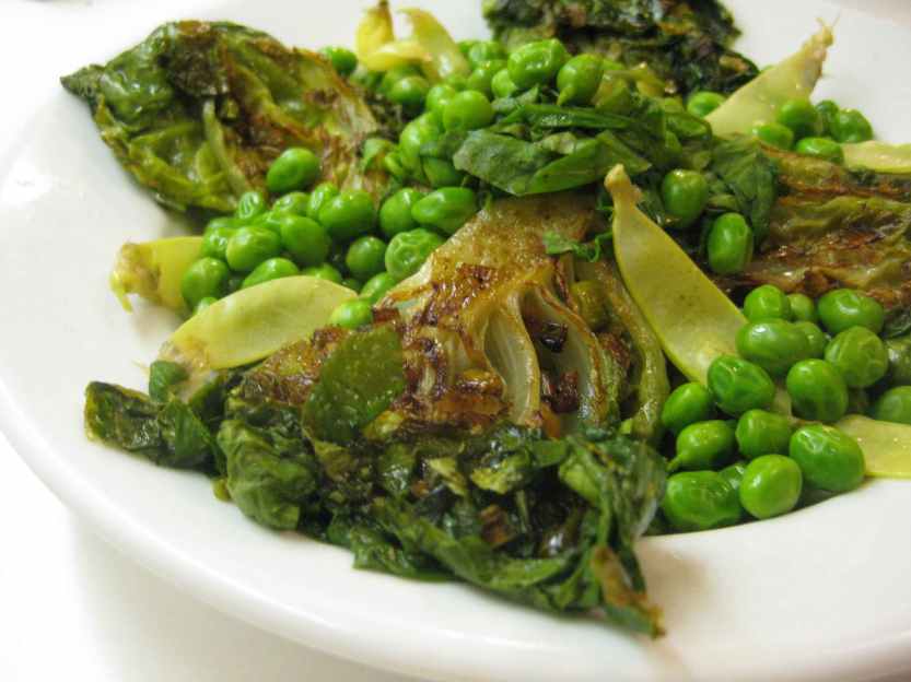 Shelling peas and snow peas are also abundant and it’s typical to steam them with lettuce leaves, but that takes care of only a few leaves not whole heads. After making a lettuce and pea soup (soup is another good way to cope with abundance), I remembered that dense heads of slightly bitter lettuce are good for grilling. There’s a favorite restaurant in Cambridge (or maybe Somerville), Massachusetts that serves grilled Romaine lettuce with some kind of garlicky dressing and Parmesan cheese, as I recall. A kind of grilled Caesar salad. Delicious. So here, in addition to cooking peas with lettuce, I cut my densest head in quarters and pan-roasted them, cut side down, in a combination of butter and olive oil. Served alongside peas, the lettuce was a meal unto itself. Except for that light kale salad we’ve been craving.