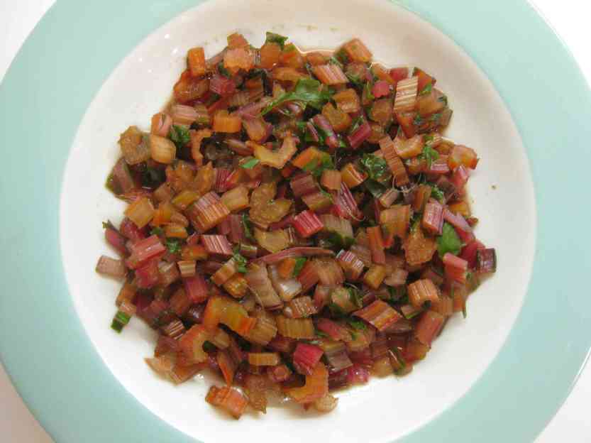 Anyway, the reason for the separation was not just a matter of color. The red chard stems are different in shape and size from the others and the leaves and stems have a more mineral-like flavor. They’re more like beet greens, no surprise, since chard and beets are in the same family. The stems of the lighter chard, including the pink ones, are similar to white. (The mix is called “rainbow chard” or sometimes “bright lights,” market-speak for their multicolored appearance.) They have broad, flat stems that when large are cut lengthwise into matchsticks (which I did). I cut the smaller red stems into dice and cooked them back-to-back with the leaves. (That 1.5 cubic feet wilted down into 3-4 pint containers!) First I cooked the leaves in the water that clung to them after washing, and then the diced stems in the remaining liquid. I stored the remaining liquid (less than ½ cup) with the stems so that I could use it in whatever dish I decided to make from the chard. Waste not want not, as they say.
