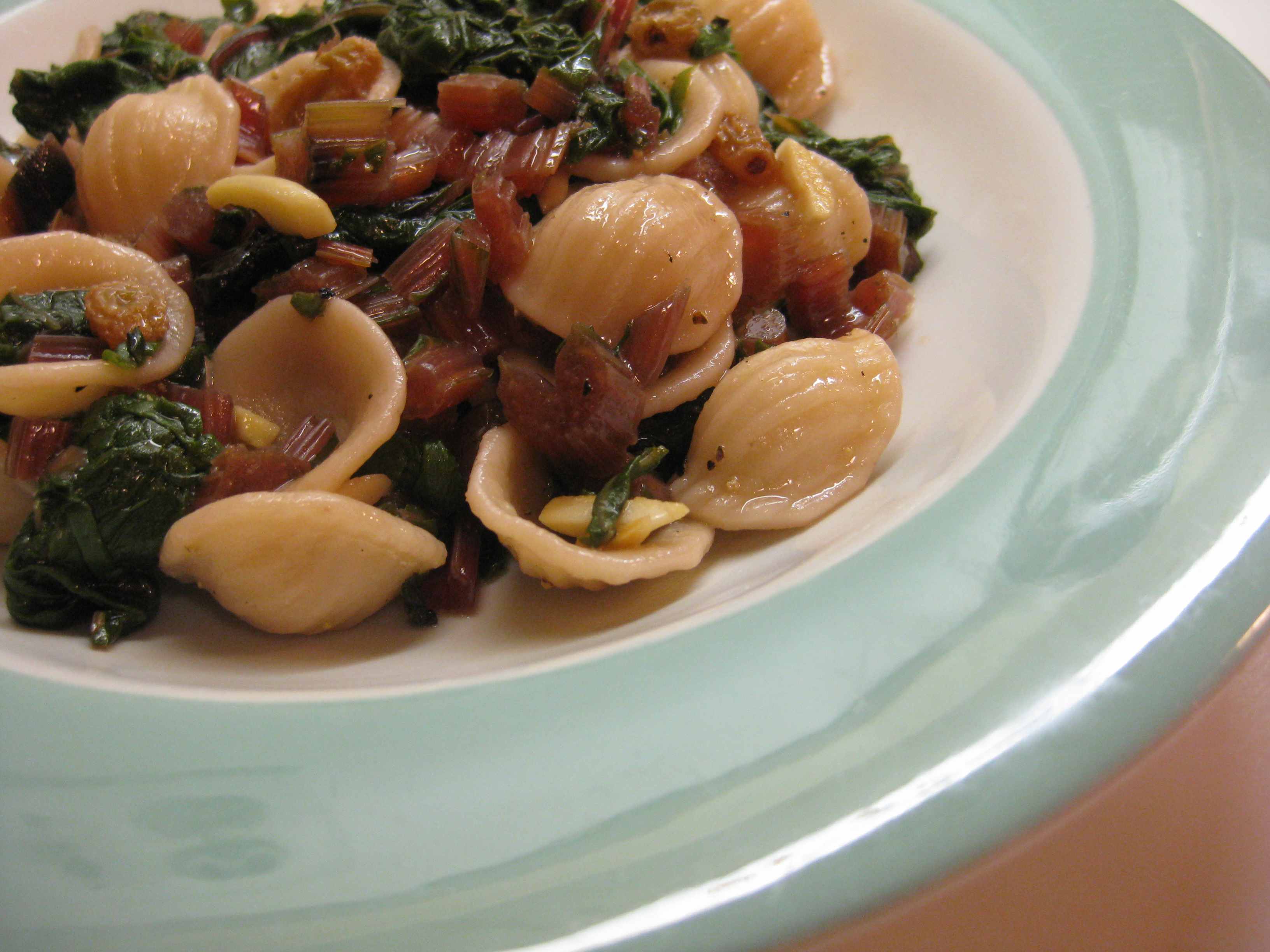 What I made was a last minute pasta dish, using orecchietta pasta, translated as “little ears,” little cups that catch the added ingredients. While the pasta was boiling, I used some of the hot liquid to soak golden sultana raisins, sautéed the previously cooked chard and stems in olive oil and plenty of garlic from our garden, and toasted slivered almonds that were going to substitute for the traditional pine nuts. I used the chard cooking liquid to moisten the lightly salted pasta.