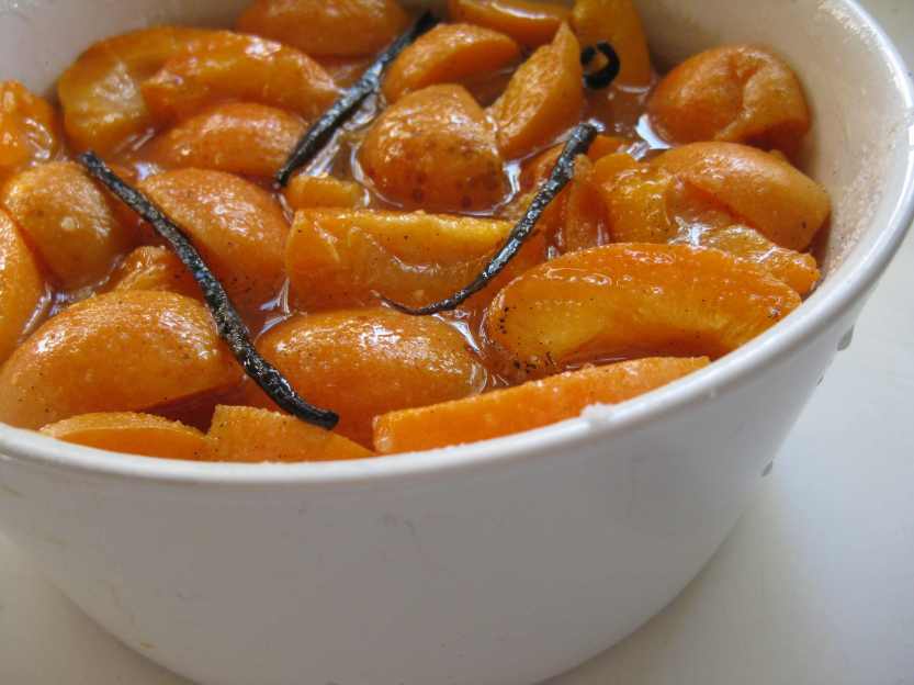 Combine all ingredients, including the sack of seeds, in a bowl and stir well. Scrape the seeds from the vanilla beans. Let the apricots macerate at room temperature for an hour, stirring occasionally to make sure that the sugar is dissolving.