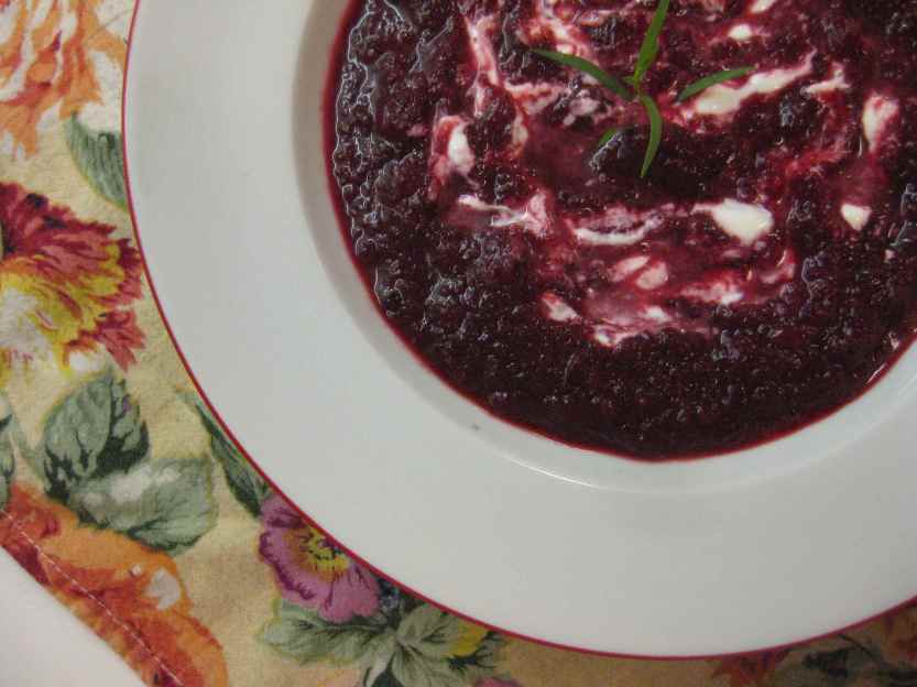 The second soup used two large beets from the weekly CSA haul, combined with a large reddish torpedo onion and the beet stem broth. I served the soup both hot and cold, like a summer-time borscht, marbled with a delicious tarragon cream. To make the soup, cook 1 large diced onion in a little butter and olive oil until translucent and add 2 large diced cooked beets (or grated fresh beets) and broth. If using cooked beets, you will need about 2 cups of broth; for raw beets, the cooking time will be longer so use more broth, about 2½ cups. Cook until very tender, 30 minutes or so, and puree with an immersion blender or food processor.