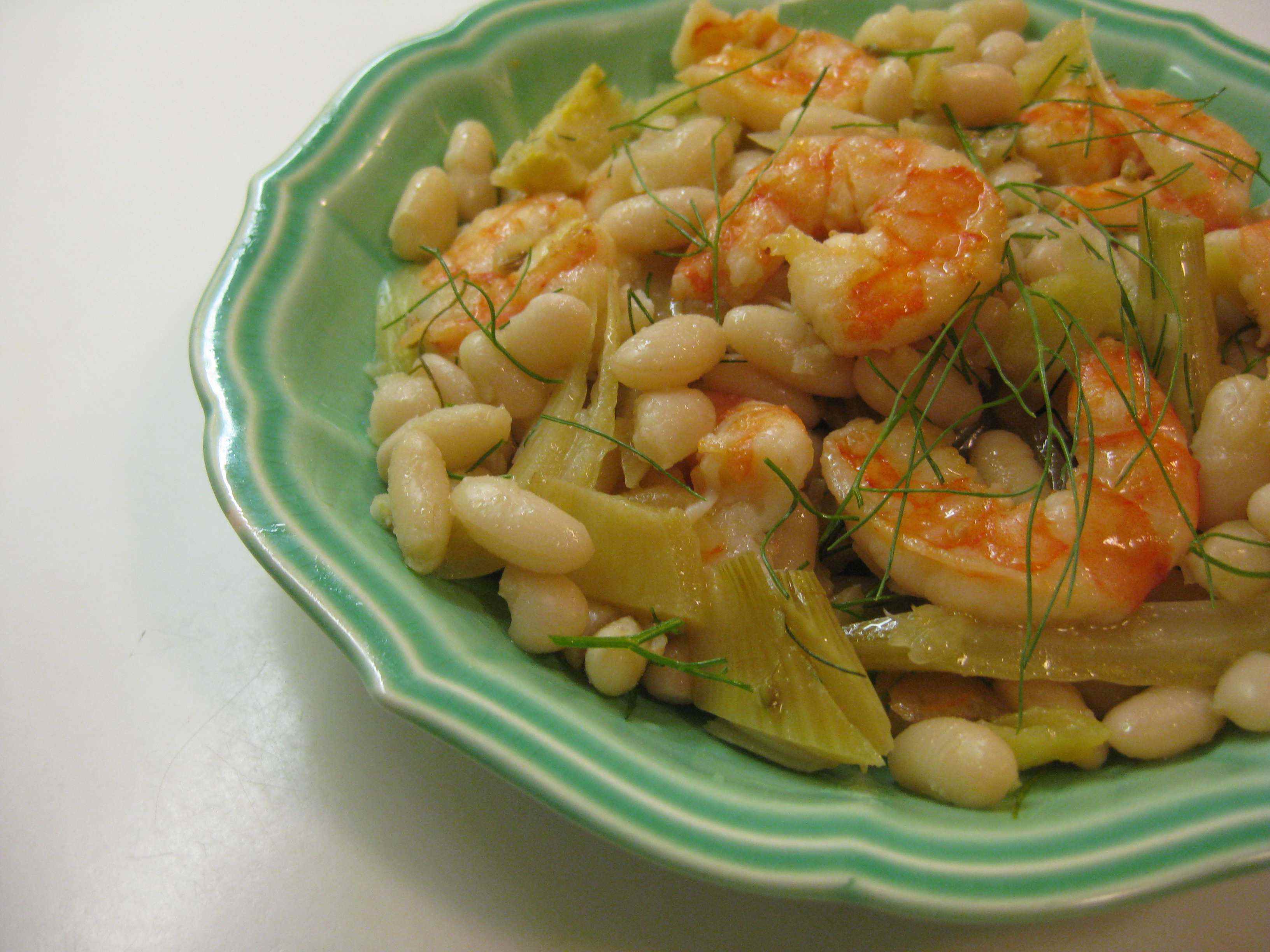 The key to flavorful bean salads, in my view, is the dressing. For one of my recent salads, I used the Fennel à la Grecque that I made earlier in the month. I chopped the fennel pieces, and combined them with beans that were moistened by the poaching liquid, an unctuous combination of olive oil, white wine and lemon. This was a perfect foil to sautéed shrimp, making this a one-dish meal.