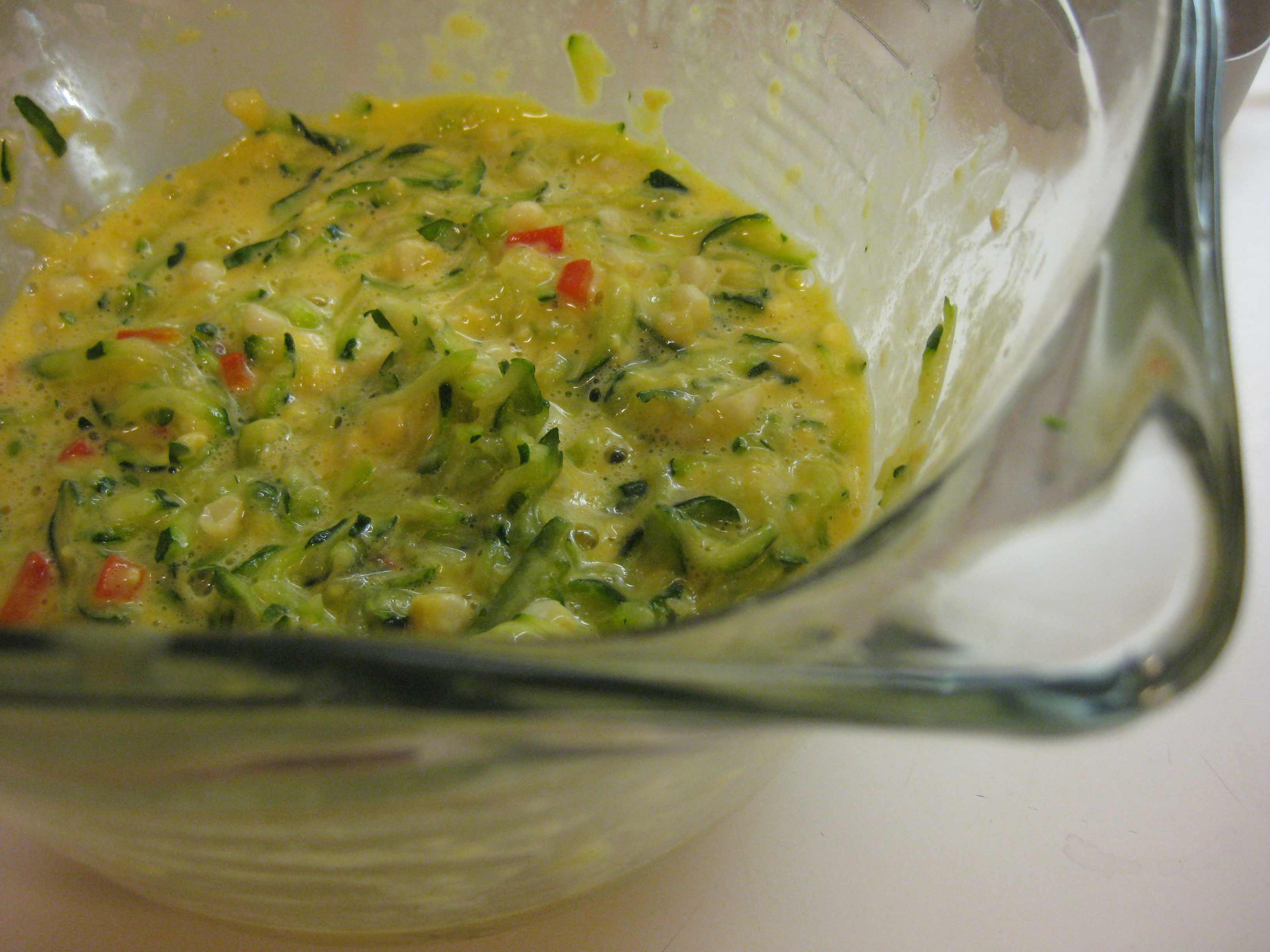 Lightly beat the eggs in a bowl. Add the drained zucchini, corn, red pepper and basil. Fold in the flour mixture until no traces of flour remain.