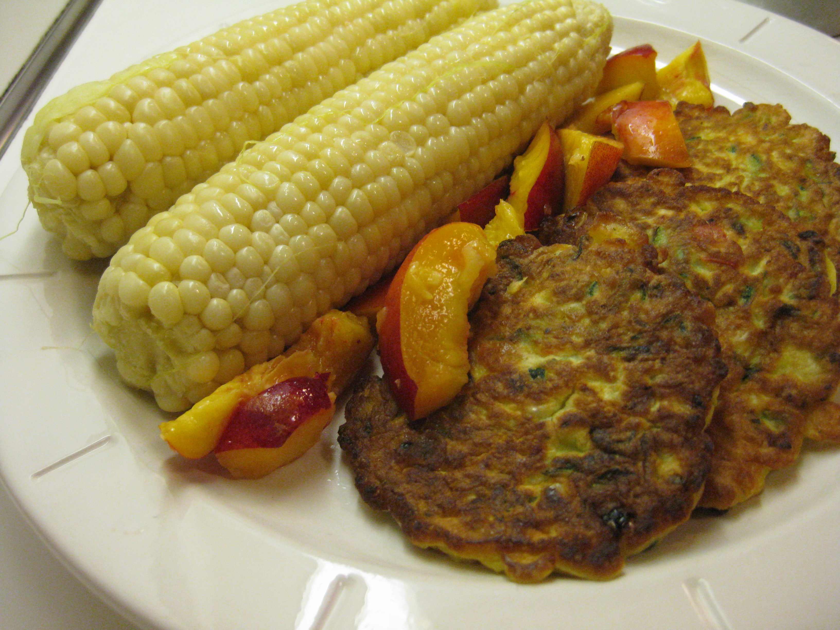 A quick meal on a hot summer night, vegetable pancakes whip up in no time. Zucchini pancakes are of course the classic, another in a long line of tricks to use up the bounteous harvest. Here I combined them with corn kernels, red pepper and basil. Served with corn on the cob and sliced nectarines, they were just the right supper for an evening in the garden.