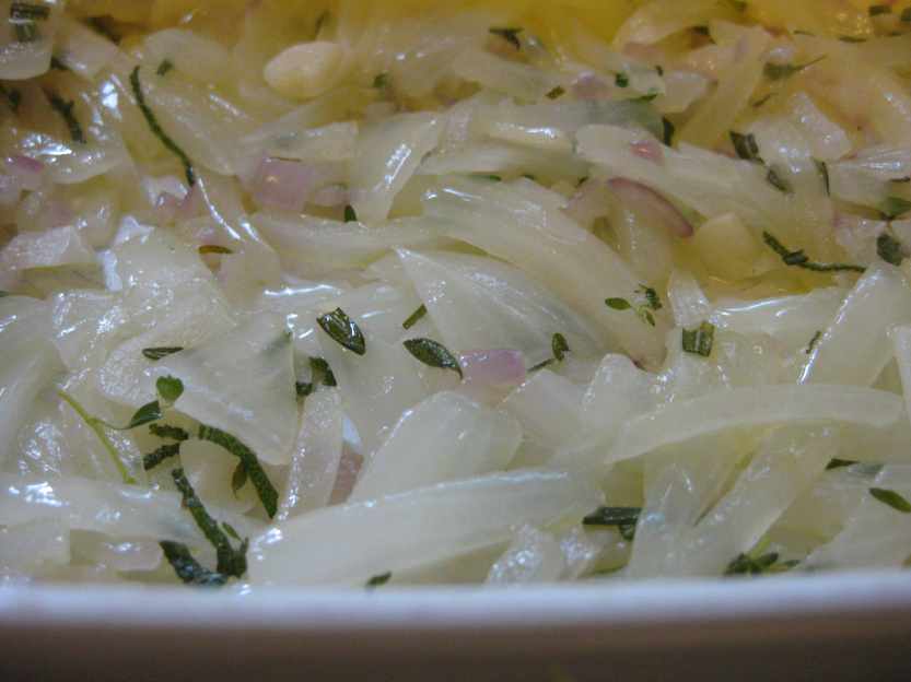 In a large sauté pan, heat 2 tbsp of the olive oil and add the onions, the garlic, half the herbs and a little salt. Cook slowly until the onions have wilted but don’t brown them. Place the mixture in the baking dish.