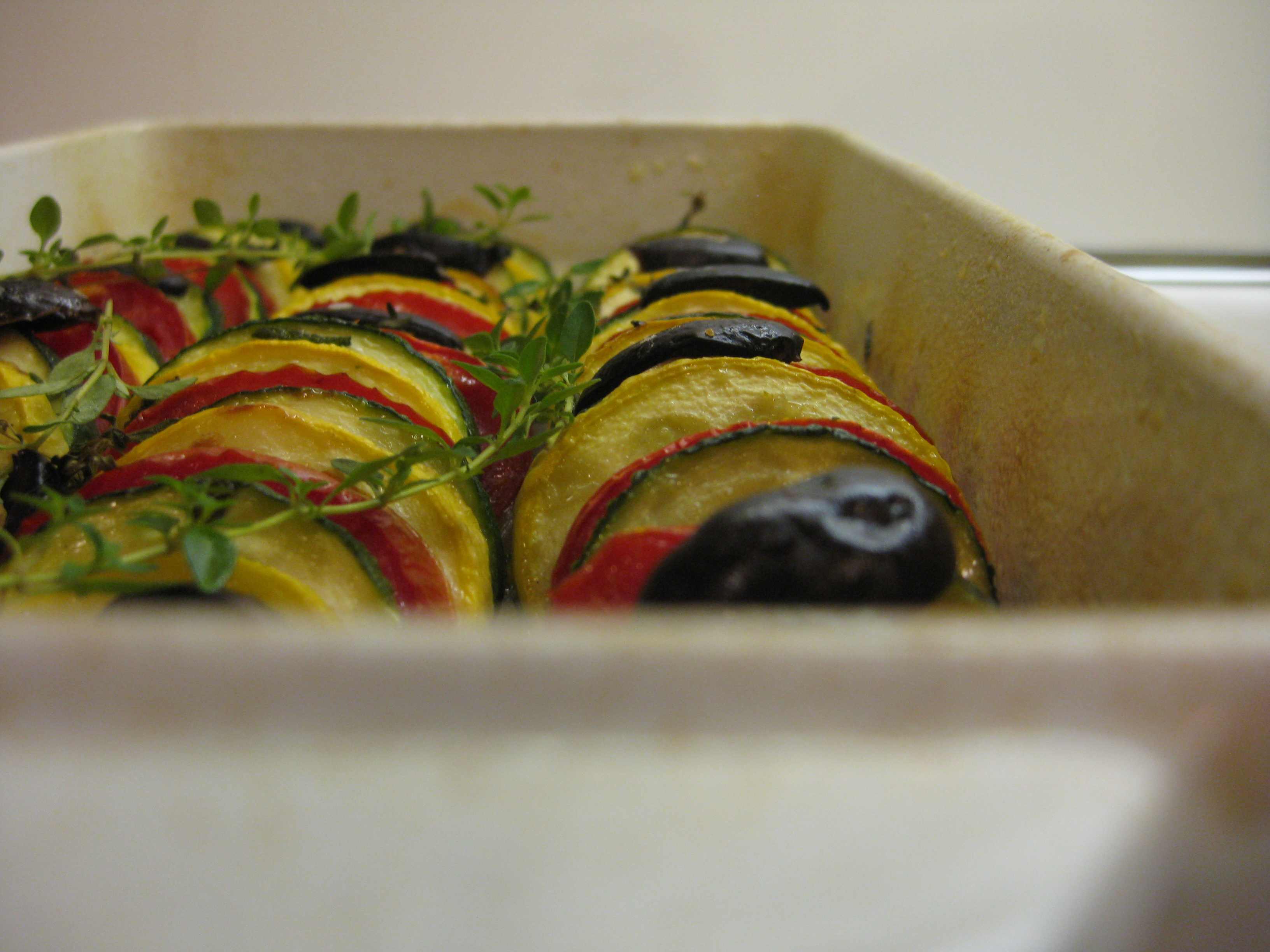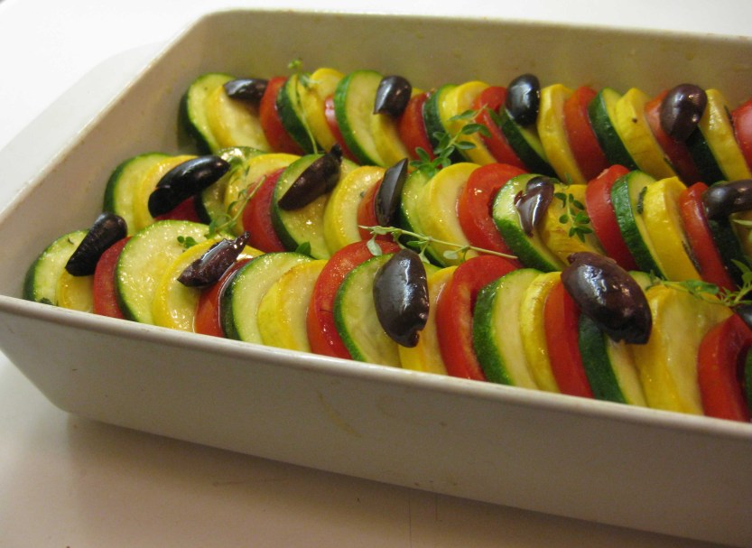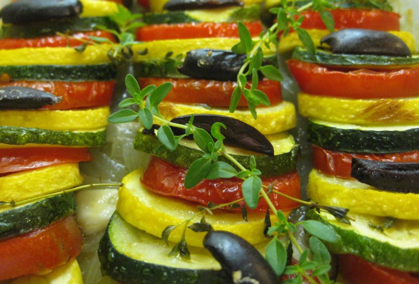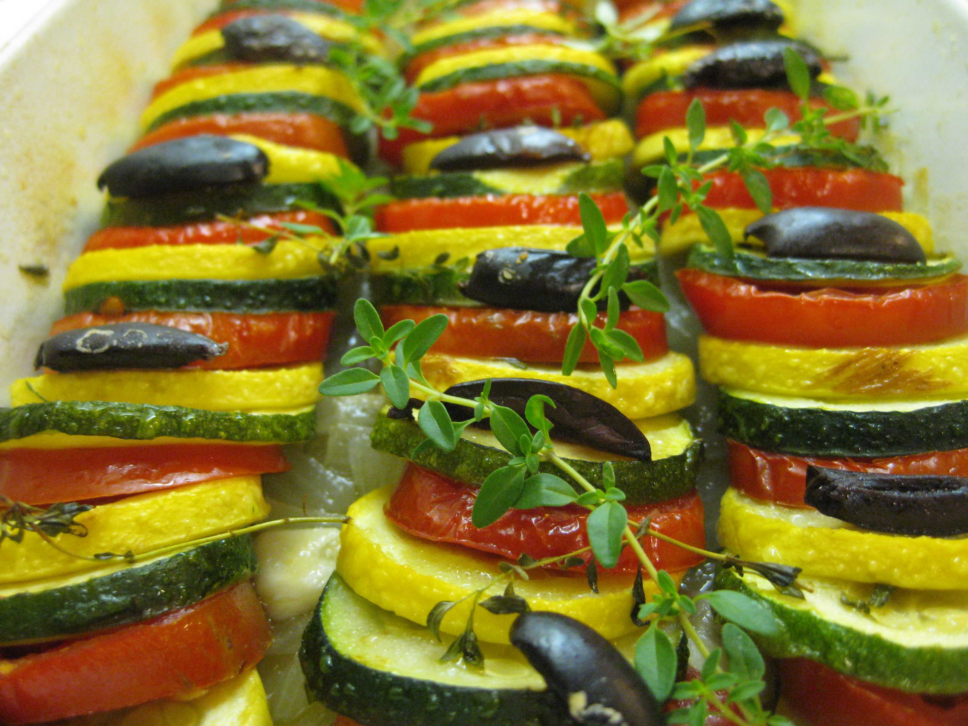 As summer winds down, the oven goes on. A Provence-inspired tian is perfect for the season. Neat layers of sliced zucchini, crookneck squash and plum tomatoes nestle atop a bed of onions, all seasoned with fresh herbs – rosemary sage and thyme—and topped with olives. Beautiful and aromatic