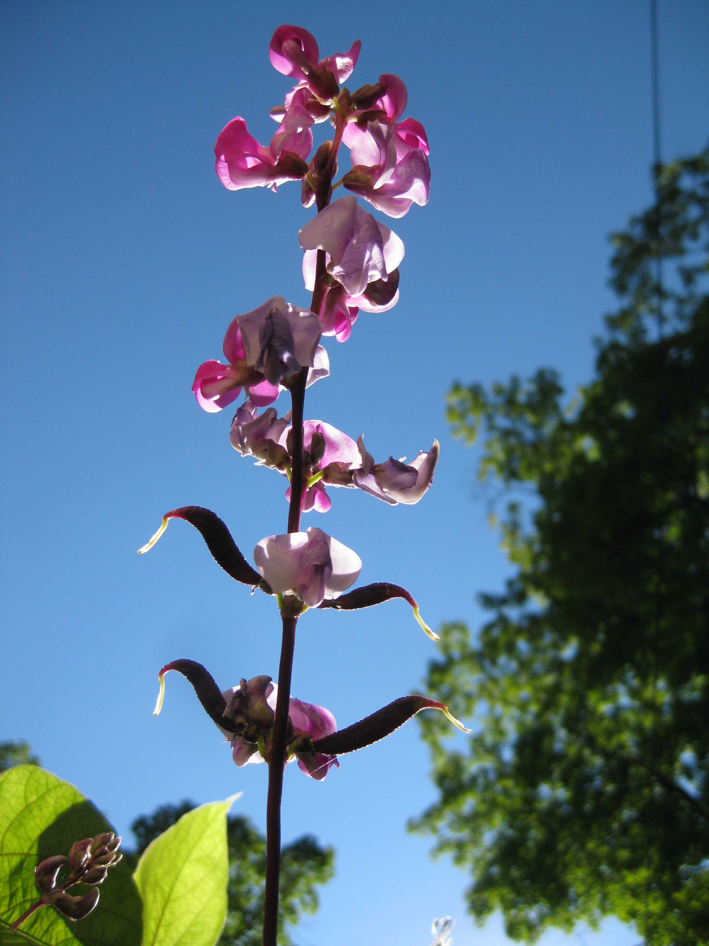 And finally, the showstopper: Purple Hyacinth Beans. The abundant flowers arrayed around long stalks turn into curving flat beans that need long slow cooking. These beans are already ten feet tall and would be taller if our trellis reached that high.
