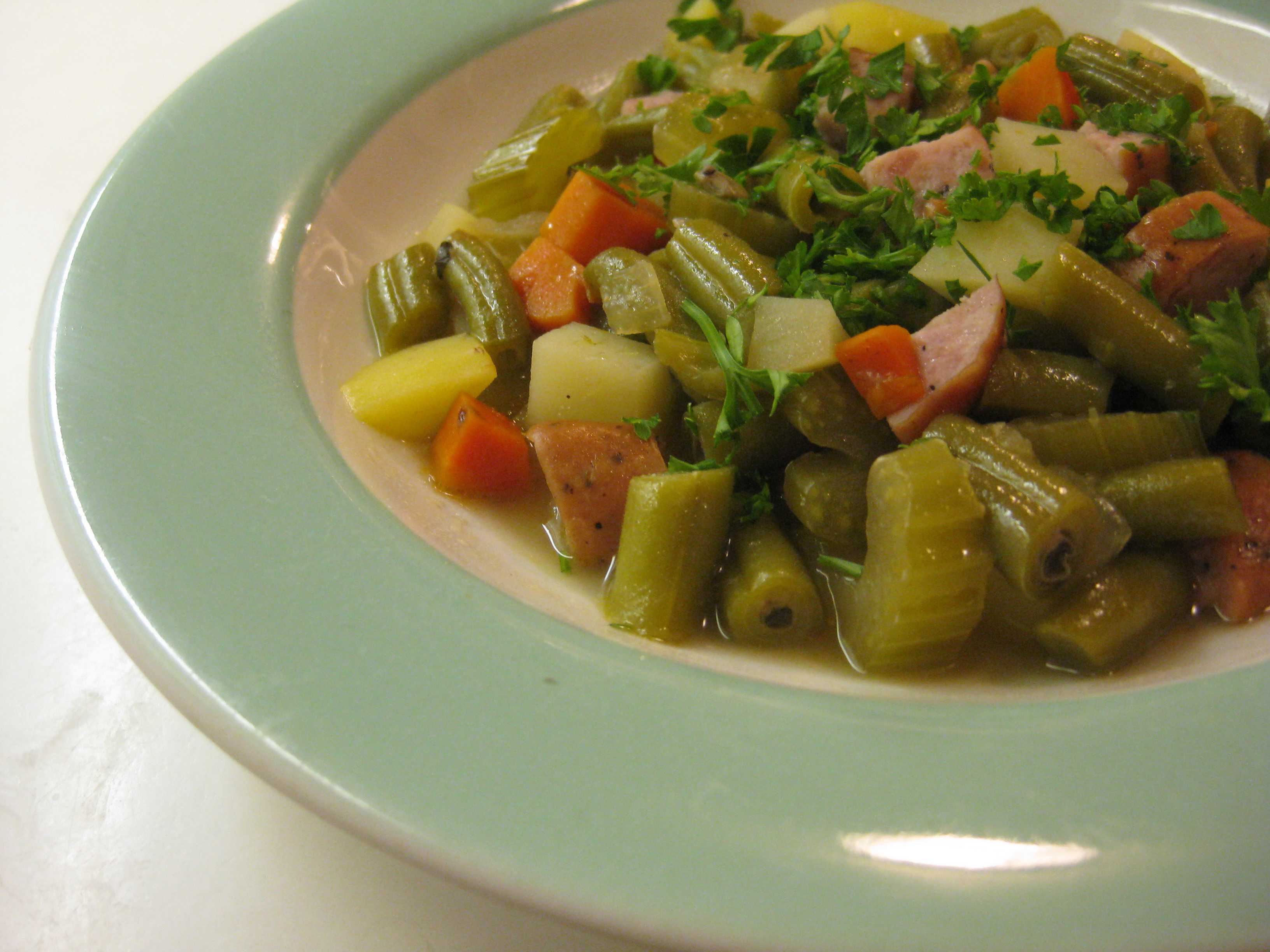 Heat the oil in a large saucepan and add the onion, celery, carrot and garlic, cooking them slowly until the onion starts to wilt. Add the green beans and stir to coat them with the oil. Add peppercorns. Add liquid barely to cover the beans and bring it to a boil. Lower the heat to simmer the vegetables until the beans are very tender, about 45 minutes. Add the potatoes, bring the mixture to a boil and lower the heat to simmer until the potatoes are tender, about 15 minutes. Add the vinegar and sausage to the mixture for the last 8-10 minutes to help flavor the liquid. Adjust the seasonings and serve with mined parsley and sour cream, if desired.