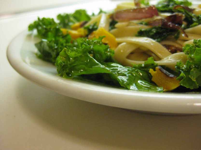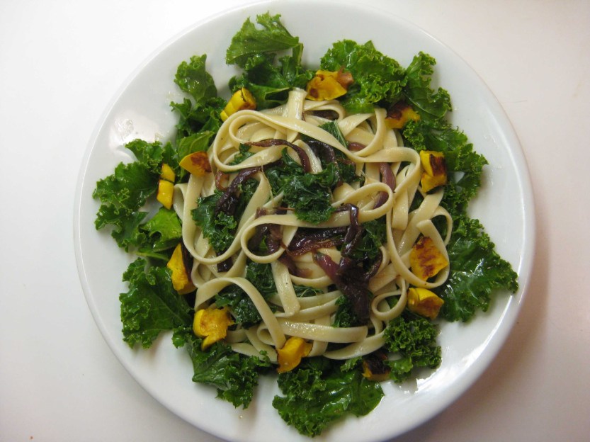 The raw and the cooked. Delicious, complexly flavored pasta with kale and stewed red onions served atop a raw kale salad with garlicky dressing. Topped with delicata squash croutons, a quintessential early fall supper.