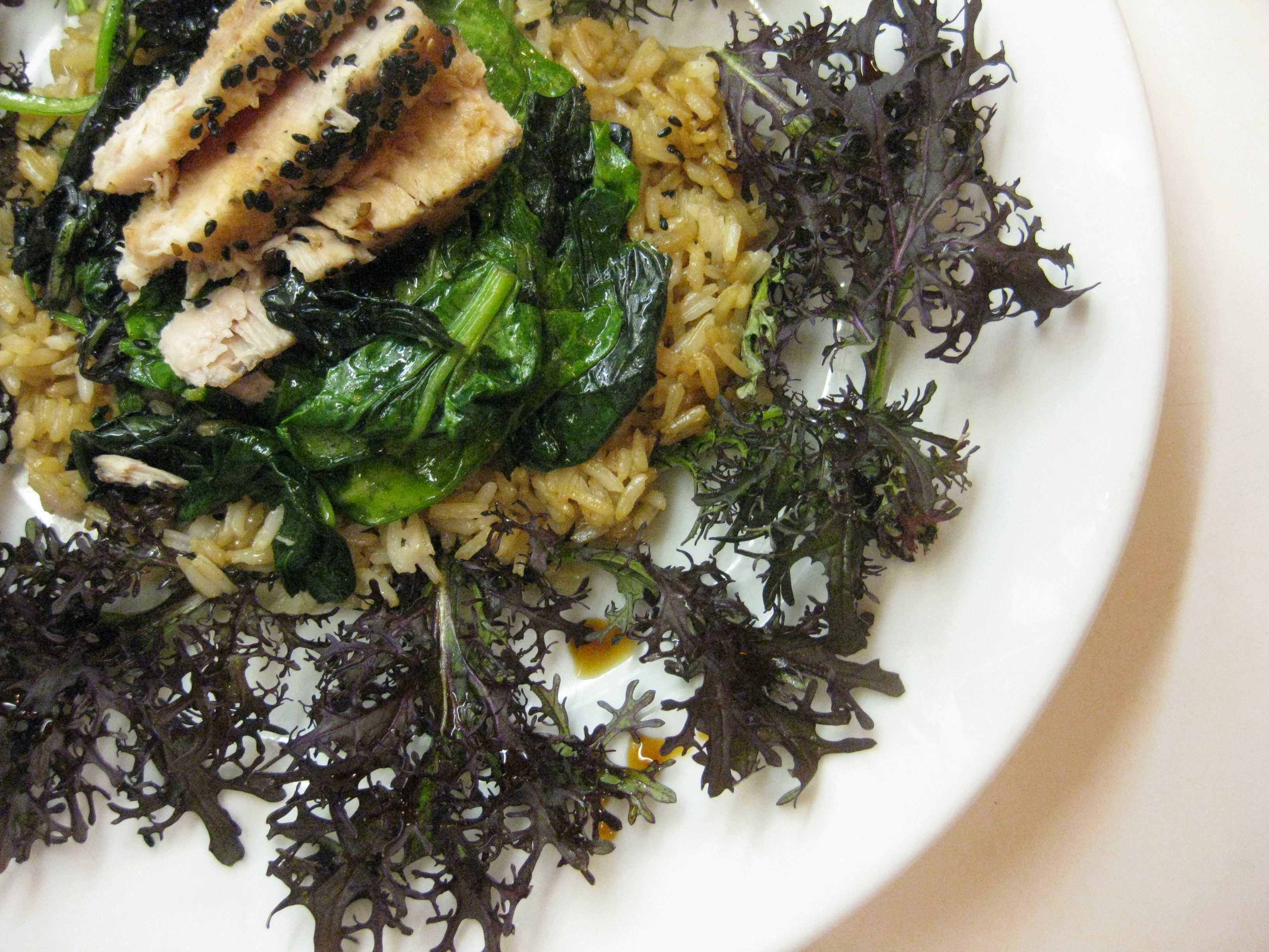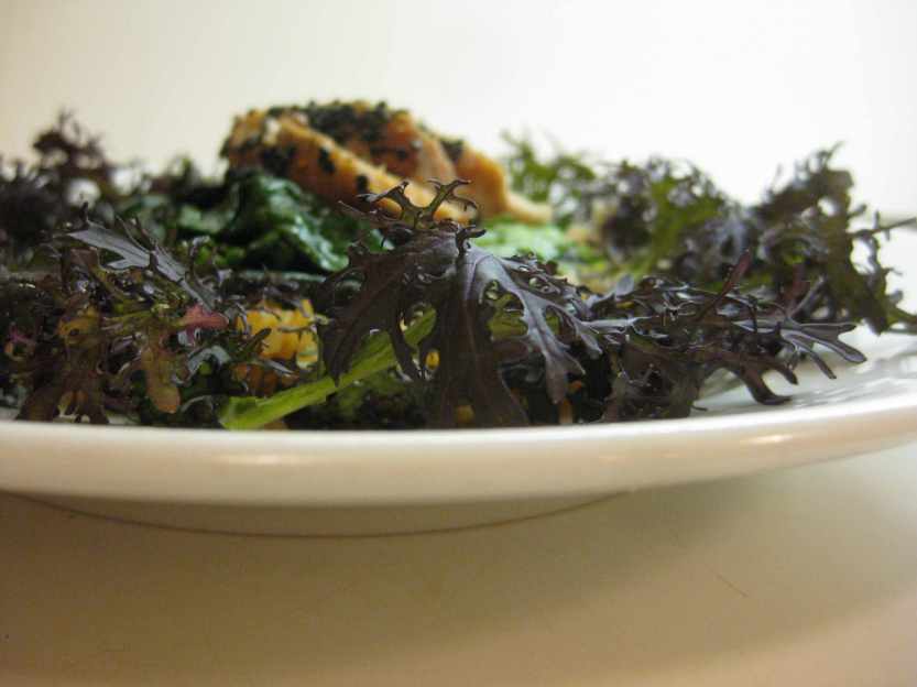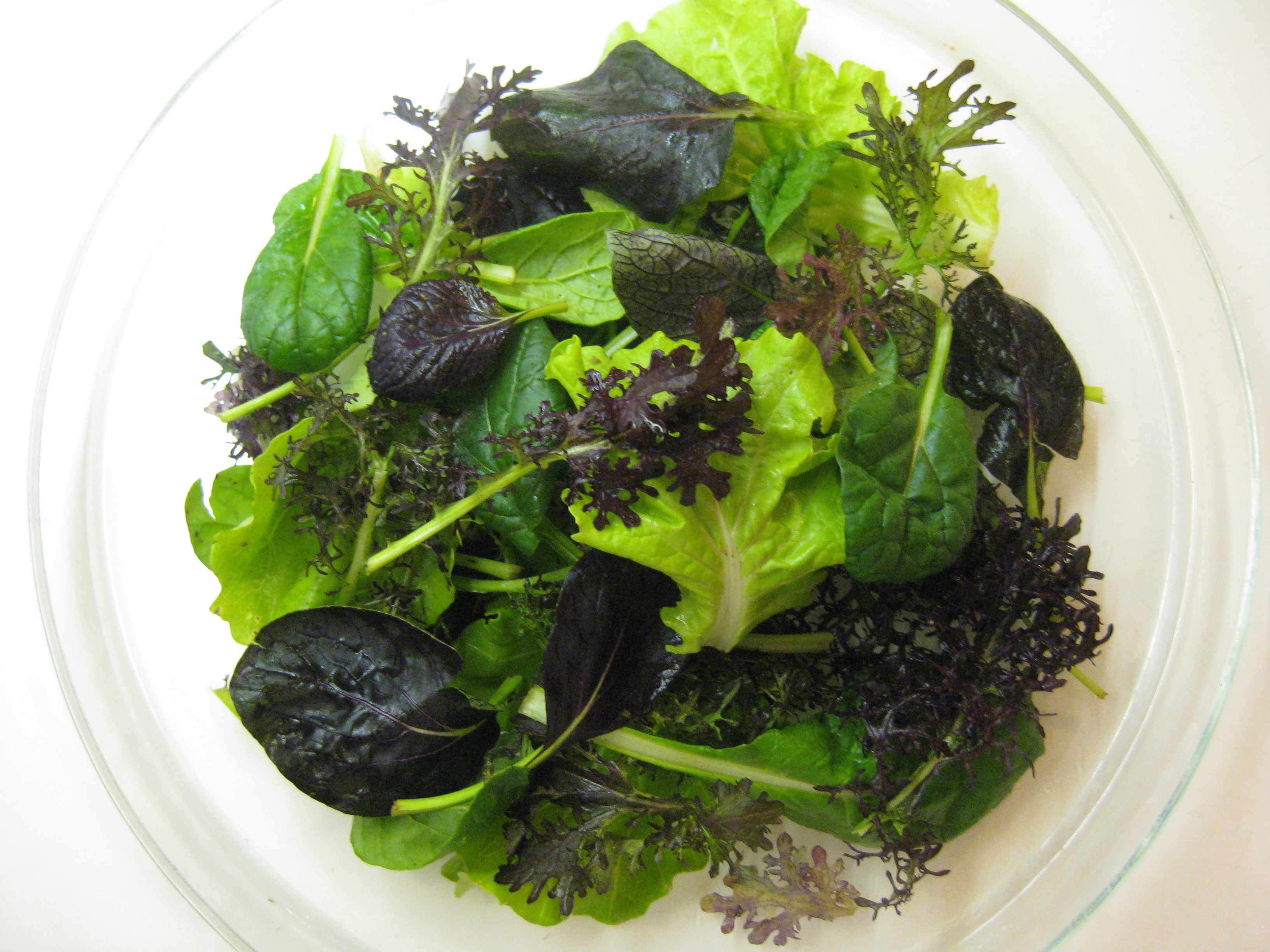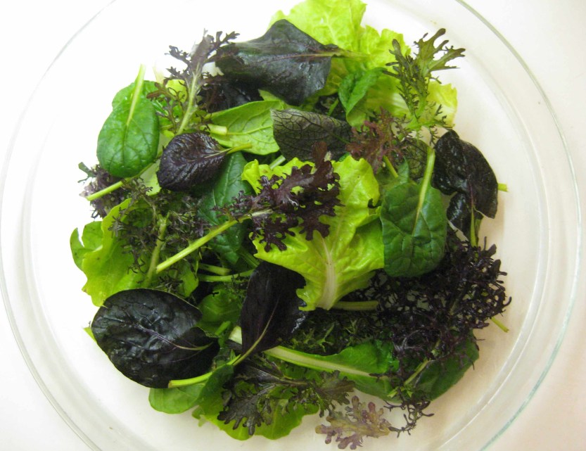 I am not a fan of mixed bouquets of flowers unless I gather them myself. Left without a choice, I buy more than one bunch and separate the flowers into types, displaying them in multiple vases. That’s what I thought about this collection of mustard greens dubbed “spicy mix” that I brought home from our CSA. Green tatsoi, tiny red Osaka, tiny leaves of green curly mustard, tender blousy leaves of pale green mustard, frisée-like red mustard. I selected the latter in abundance from the bin since I thought it would be good as salad greens. The other mustards were more worthy of a stir-fry. This combination of greens is sometimes called “braising mix,” a preparation that would be overkill for such a fresh bunch of greens.