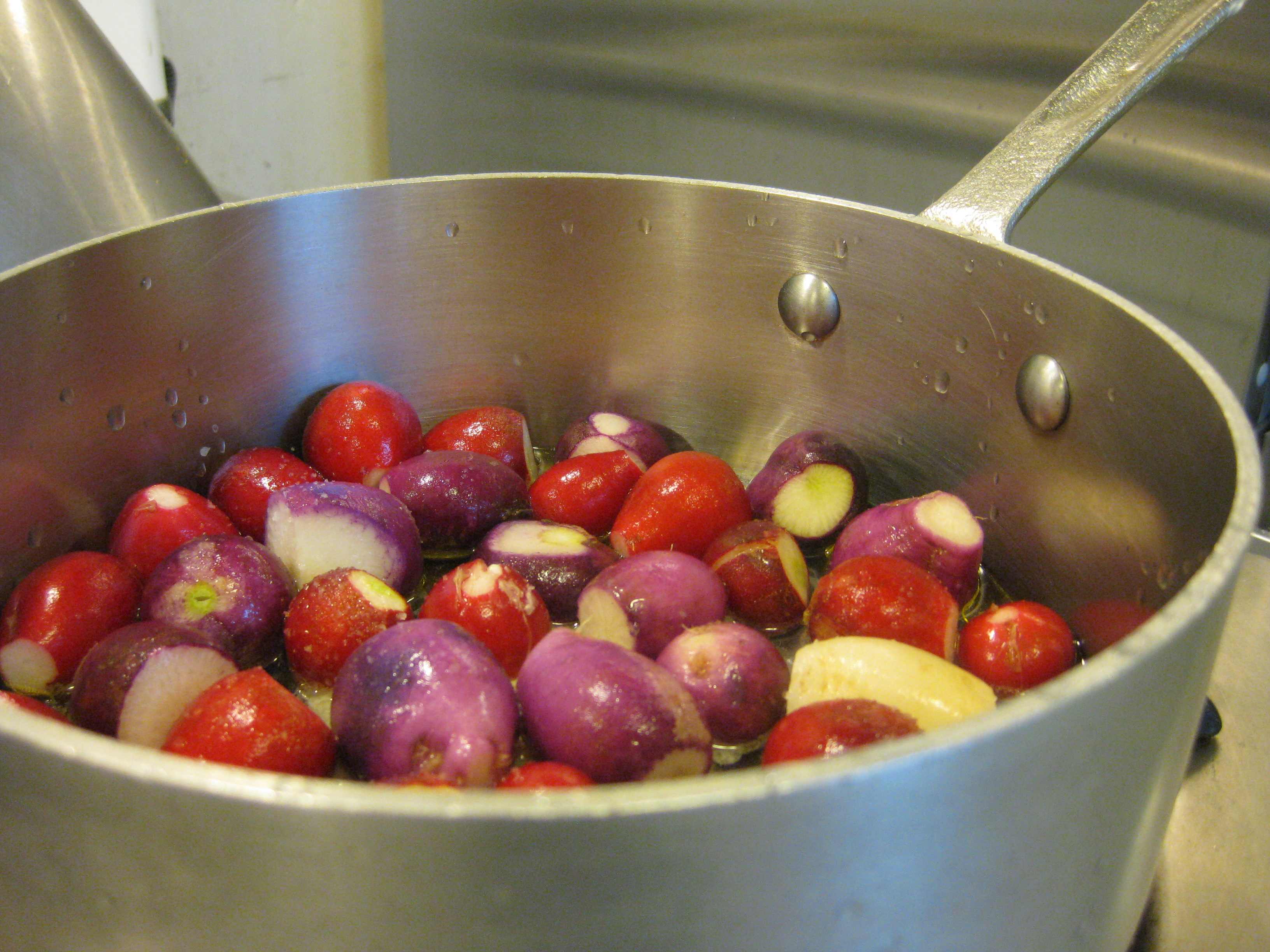 Top, tail and thoroughly clean 2 bunches of radishes. Place radishes in one layer in a pan with a tight fitting lid, and add water to a depth of about ¼ inch, a splash of olive oil (or use butter), and a big pinch of salt. Bring the liquid to a boil, lower the heat, cover the pan and cook gently, stirring the radishes a few times until crisp-tender, about 5 minutes depending on the size and age of your radishes.