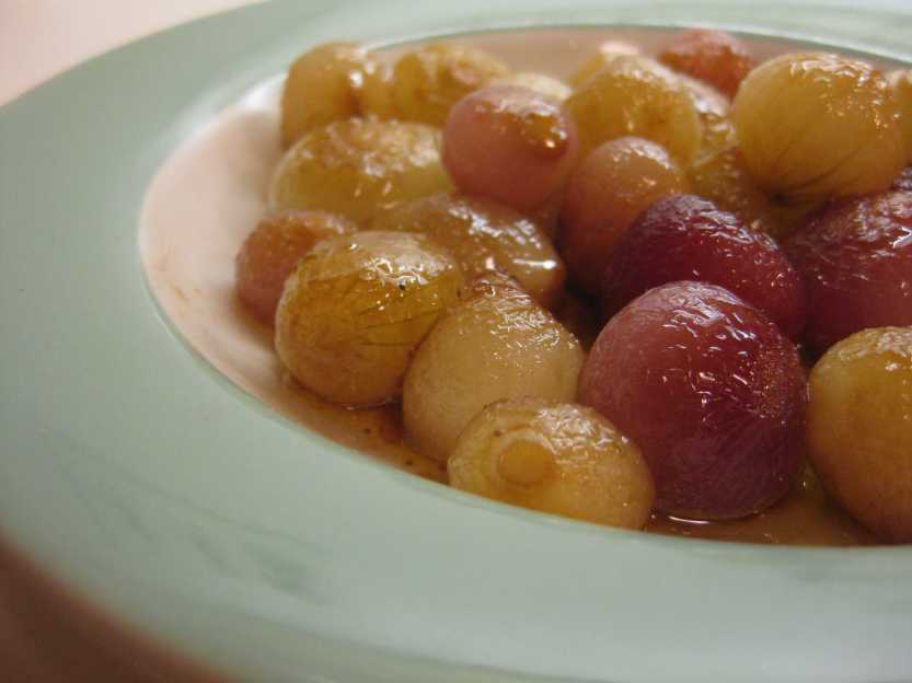 Little onions, including so-called pearl onions and cipollini, are a pain to peel. In the past, I’ve slit the bottoms, dunked them in boiling water and pinched them to release the centers before sautéing them in oil, adding sugar to caramelize them, and deglazing the pan with vinegar and stock. This time, I cooked them with the skins on in simmering water until nearly tender, cooled them slightly and stripped the skin off, before braising and glazing them in olive oil, red wine vinegar and sugar, tempered by the adding of a bay leaf. This was much less time-consuming than my previous peeling method.