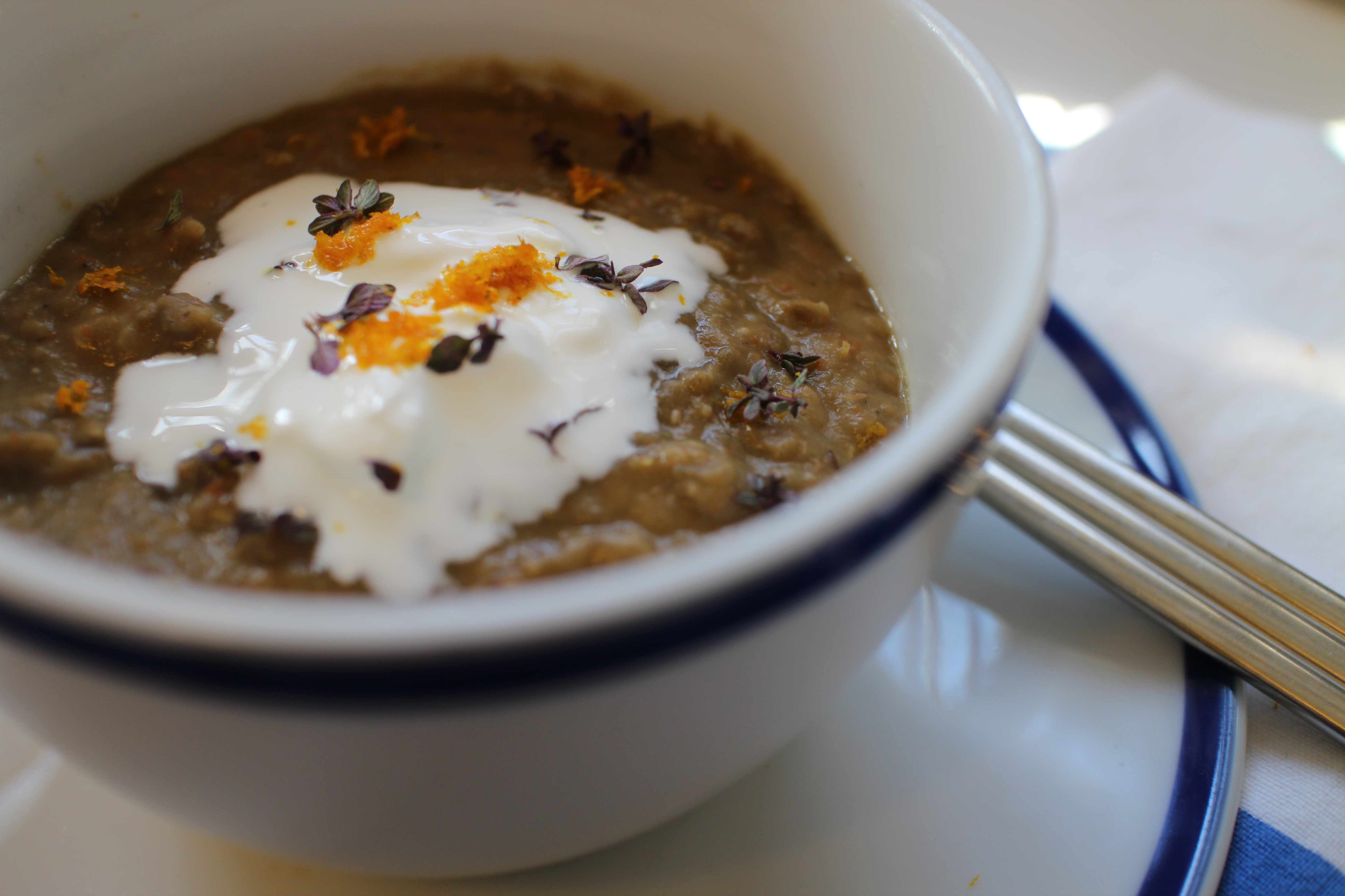 The proportions are pretty simple. She uses 1 cup of lentils to 6 cups of liquid (I used 4 and reserved the rest to thin the soup to taste, which it hardly needed). An onion, a carrot and two stalks of celery with leaves, all chopped, are stewed in vegetable oil and added to the pot, along with a sizeable strip of orange peel (1×2 inches), 1-inch piece of ginger grated, 6 peppercorns, 1 clove and 4 coriander seeds. After simmering, covered, for 45 minutes, you add a teaspoon of salt and fresh black pepper to taste. Continue to cook until the mixture is very soft (altogether an hour or a little more) and puree it the soup in a food processor until smooth. This makes about 6 servings. I’m not going to say it serves 6 people though, since everyone wanted more than one bowl. It was that good.