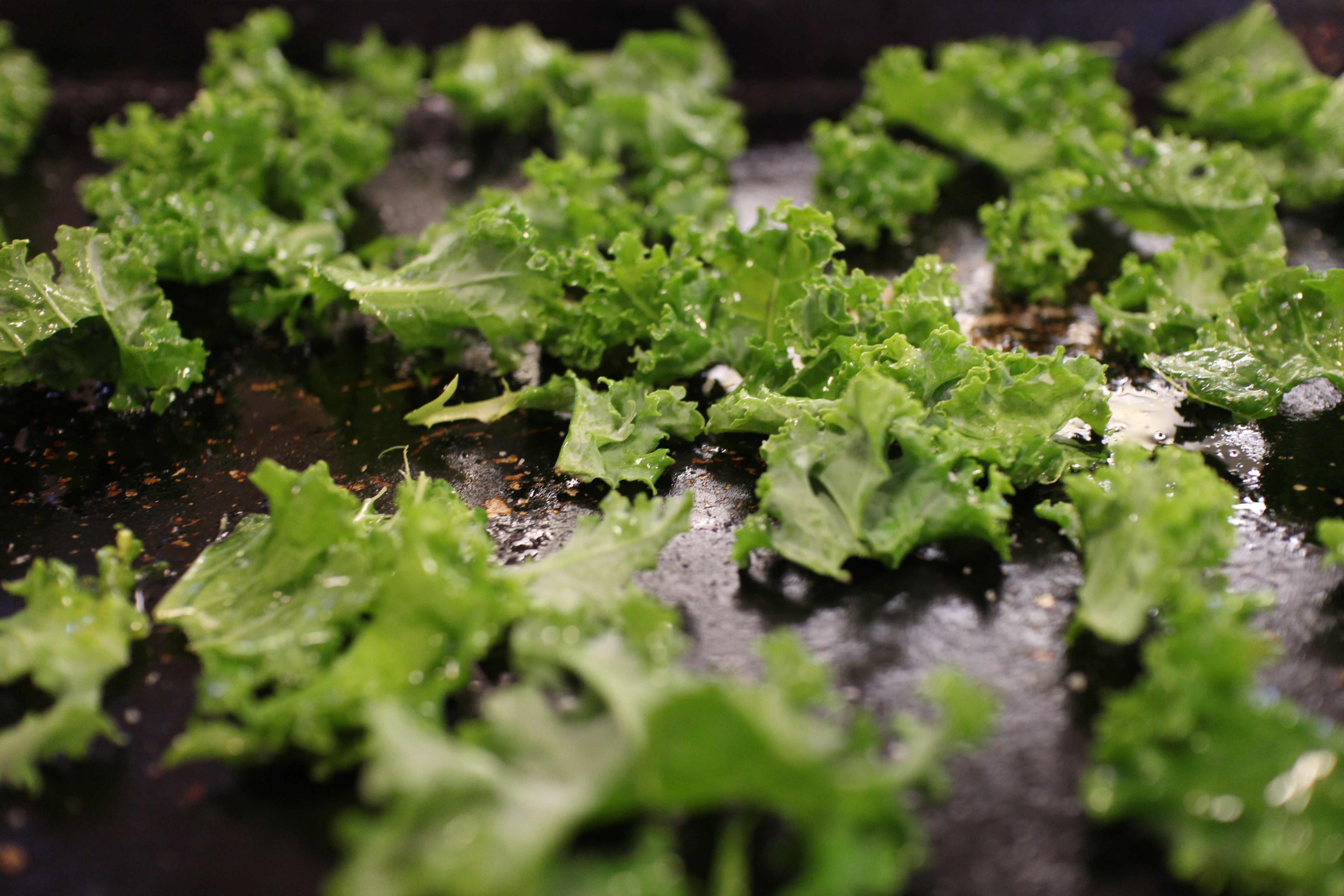 Heat the oven to 350 degrees. Tear the kale leaves into small pieces. Place them on a baking sheet and sprinkle them with a little olive oil. Rub the leaves to absorb the oil. Sprinkle with salt. Place the pan in the oven and cook the kale for 10 minutes or a little longer, until the edges start to dry but not brown. Remove from the baking pan to cool.