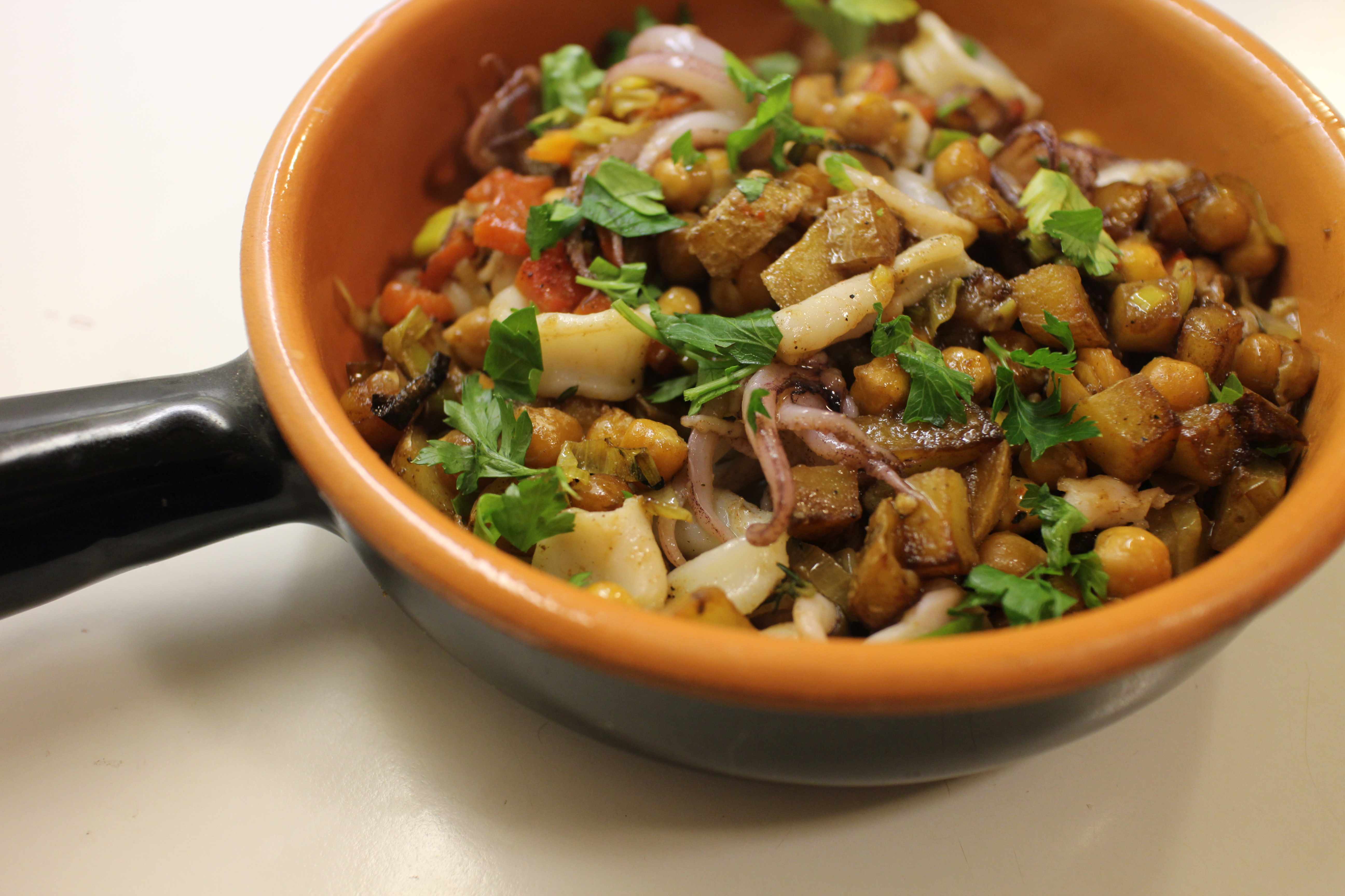 The other two experiments were equally successful. I liked the Squid with Chickpeas, Potatoes, and Piquillo Peppers (p. 214). I’ve been thinking about Spanish tapas and had a big pot of just-cooked chickpeas on hand. It made a tasty light supper served it in a terra cotta pan that pretends to be a cazuela. I can imagine serving it in tiny glazed terra cotta plates for a tasting menu. You know, the kind they sell to keep potted plants from leaking on your table.