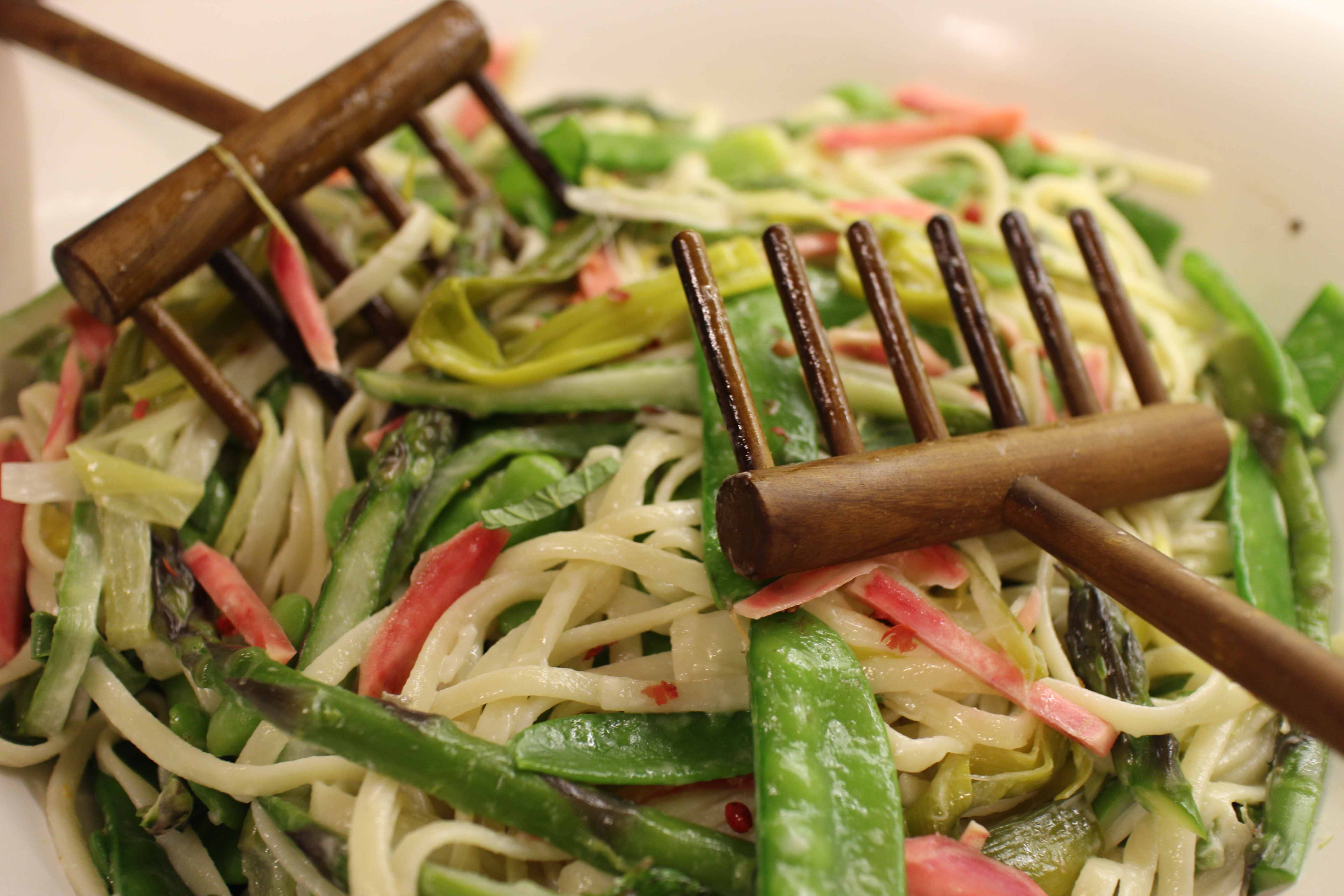 For a small party a week later, I repeated the combination of asparagus and leeks with pasta, but added parboiled snow peas, shelled fava beans and slivered spring radishes that had been marinated in rice vinegar and sugar while the other ingredients cooked. The crispy pink and green veggies created a visual and textural counterpoint to the softness of the vegetable and pasta noodles. The seasonal medley felt like spring – primavera — and we were happy.
