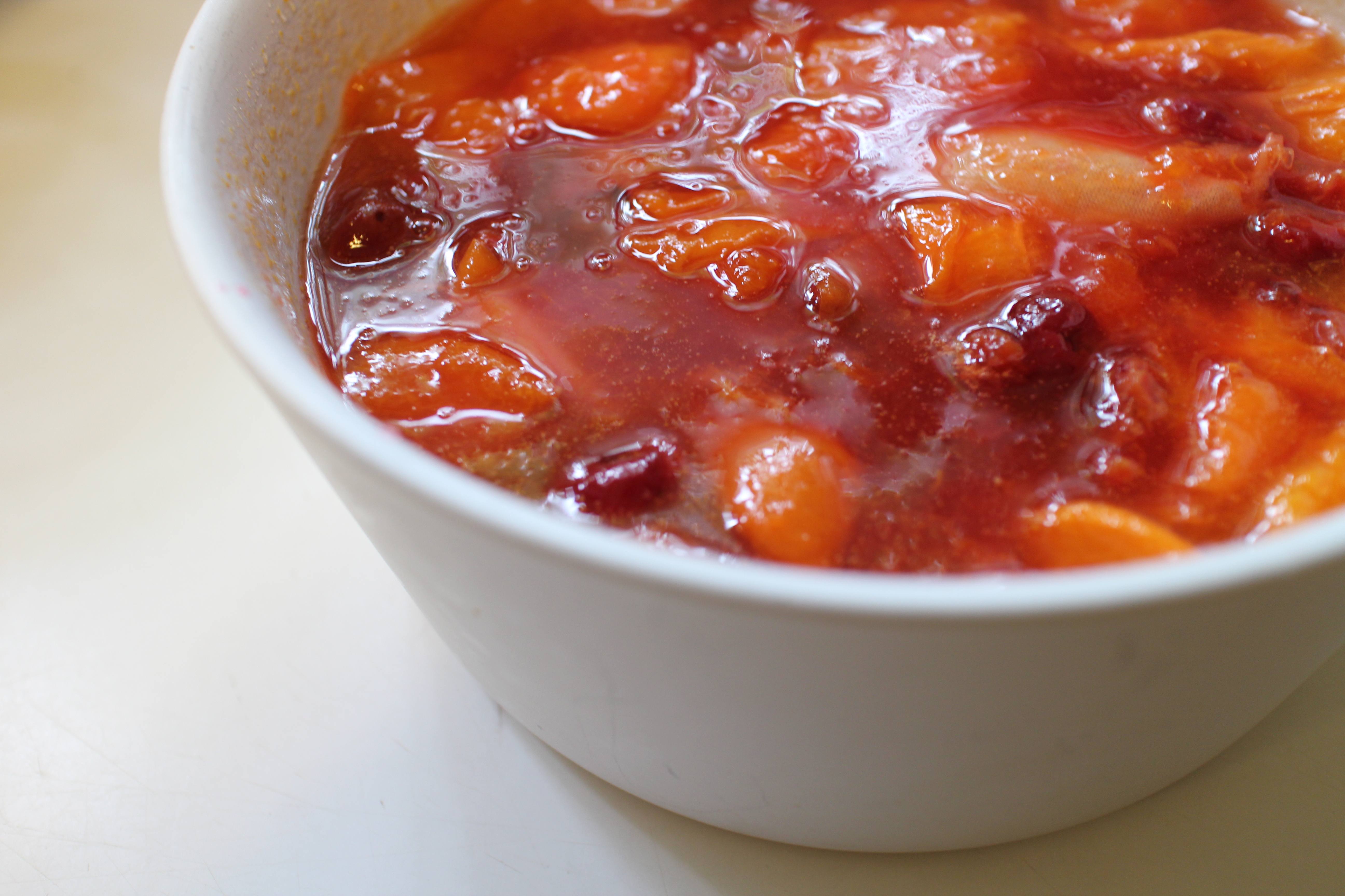 Combine the sour cherries and apricots and, when cool, cover them with crinkled parchment and once cooled, let sit for 6 hours or overnight in the refrigerator.