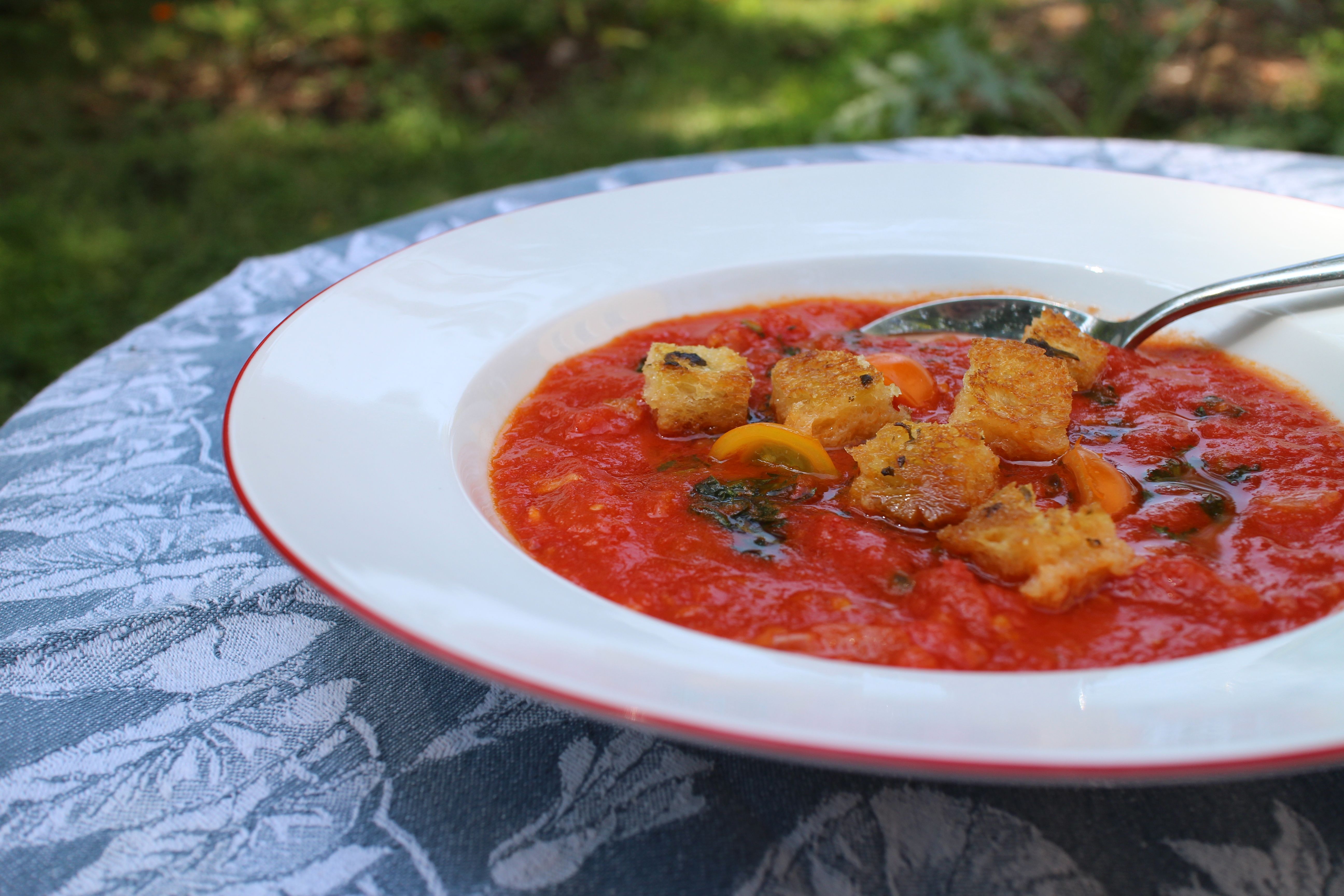 For the tomato soup, I simply sautéed chopped onion and garlic in olive oil in a large saucepan over medium low heat, added the tomatoes and the tomato liquid and let the mixture simmer, covered, for about 25 minutes. (If I were canning these, I would do the same except that I wouldn’t cover the pan since I’d want the puree to be reduced. For soup, I wanted to preserve the liquid. When the tomatoes were sufficiently broken down, I pureed them with a stick blender. If the result is too thick for soup, you can add vegetable stock or chicken broth, or cream. Mine was fine. I brightened it up with basil pesto and added a contrasting crunch from croutons that had been baked with some of the basil pesto, along with fresh sweet cherry tomatoes, from our garden. Hooray.