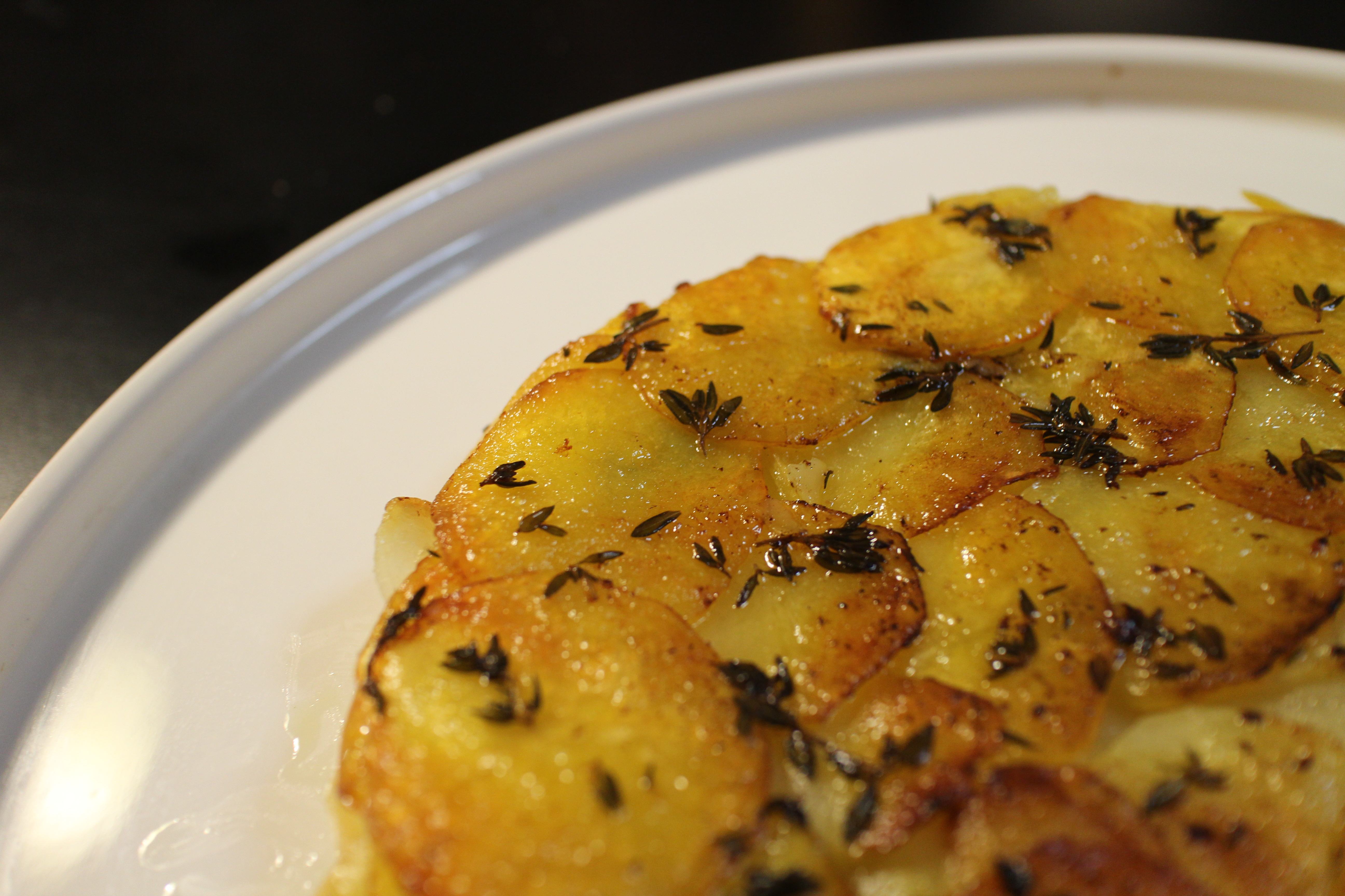 Heat the oven to 400 degrees. Butter a one-quart shallow baking dish (I used enameled cast iron). Arrange potatoes slices evenly in a circle on the bottom. Brush with butter, sprinkle with salt and thyme and repeat until all of the slices are used. Baked uncovered until crispy on the outside and fully cooked through, about 25 minutes. Unmold on a flat plate and cut into wedges.