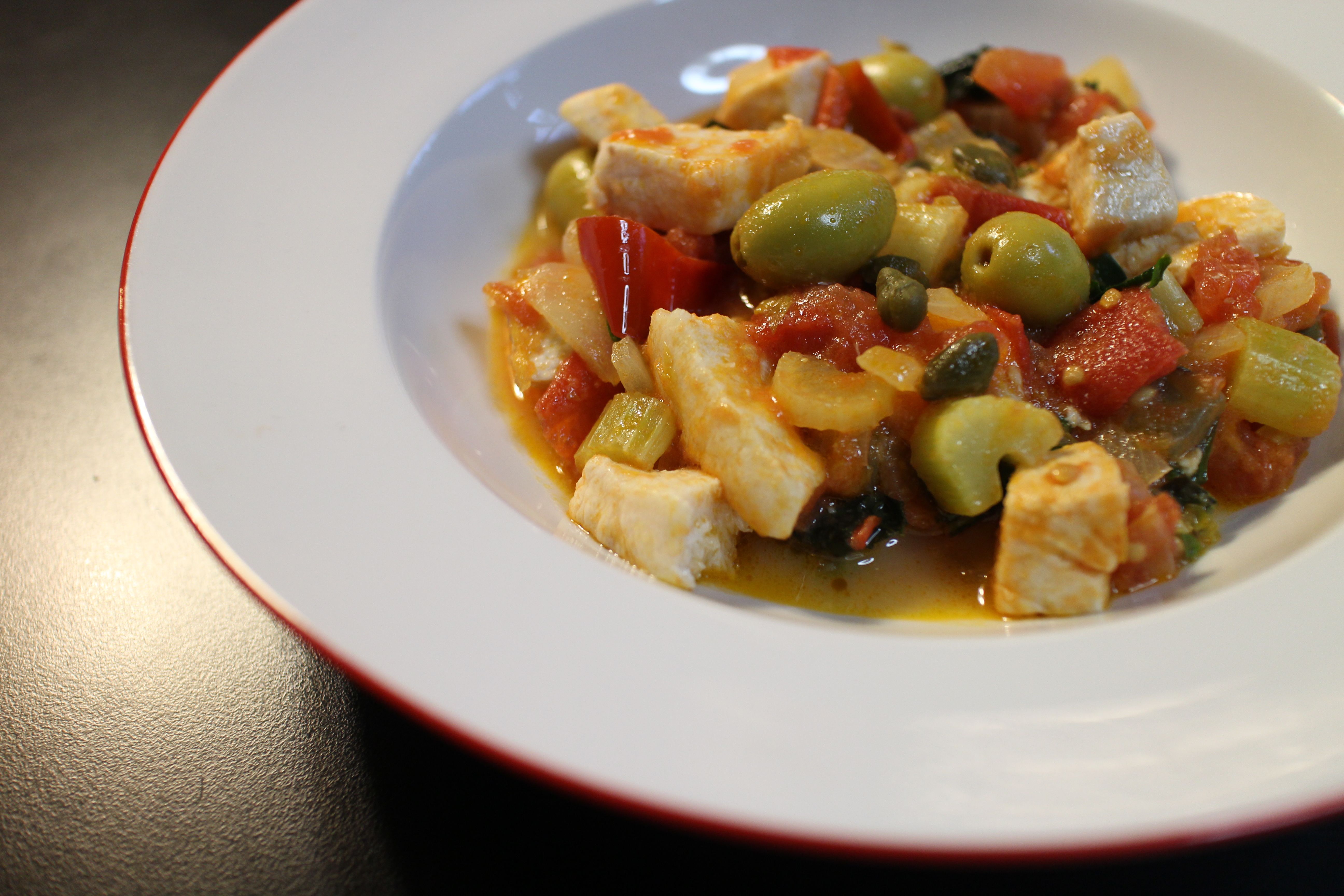 A little goes a long way in this stew. Vaguely Sicilian, it uses swordfish chunks, trimmings that our local fishmonger sells for less than the steaks. No bargain, of course, since high quality seafood is understandably dear. But cut into ¾-inch pieces, it seems like a generous amount of fish. The stew is great to make at this time of year when fresh tomatoes are abundant, but canned plum tomatoes work just fine for winter fare. The base of onions, celery and tomatoes is made piquant by the addition of salty capers, orange zest, and green olives. It’s a great combination.