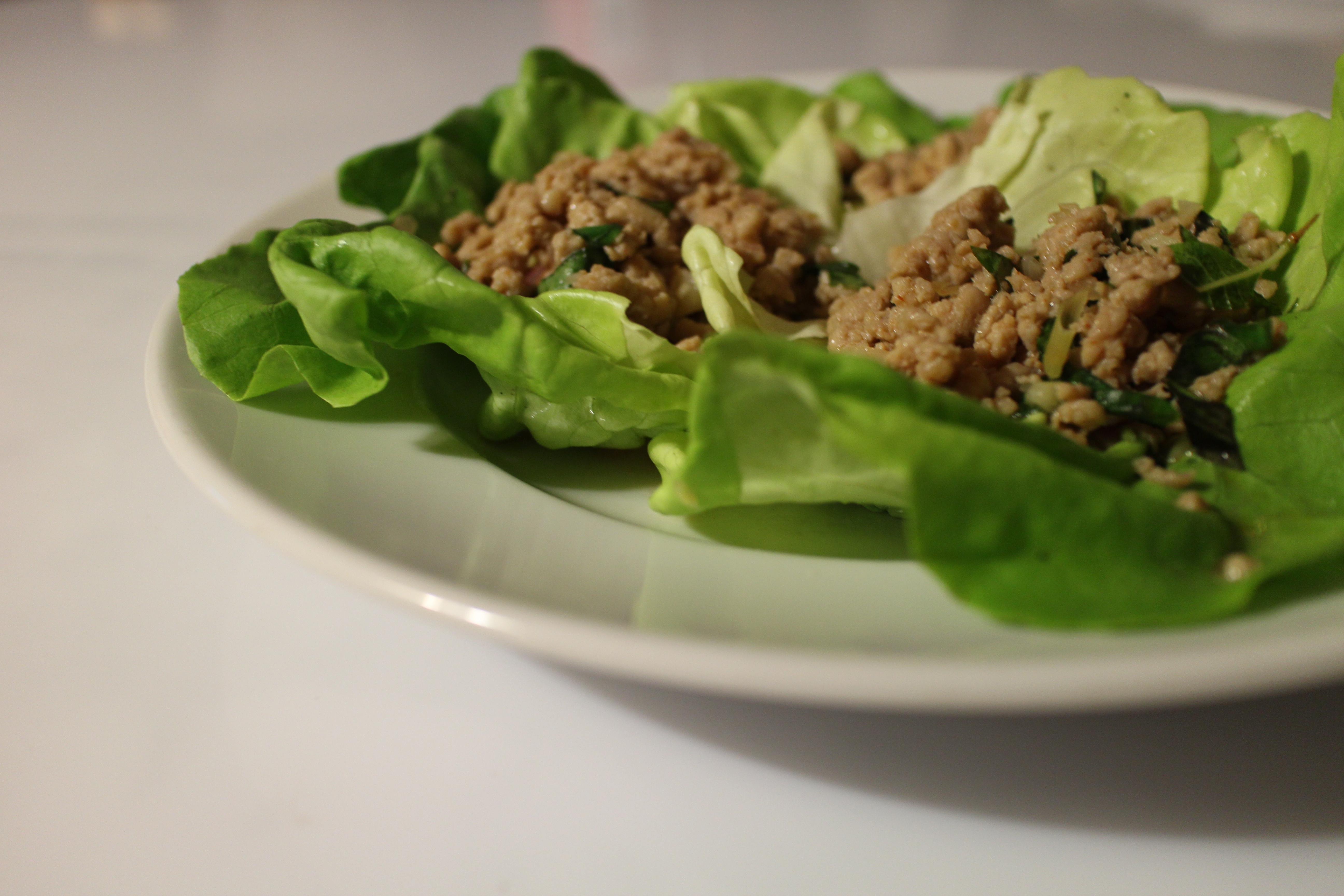 Since I was planning Thai basil chicken to use up the Thai basil in our garden before the fall freeze soon to be on us, I made a related chicken sauté for filling the lettuce. I should do this more often: think of ways to fill lettuce leaves. Given the flight from grains and gluten that’s prevalent (for good reason) in our household, lettuce is the new pita, lavash, tortilla and sandwich bread. Go green!