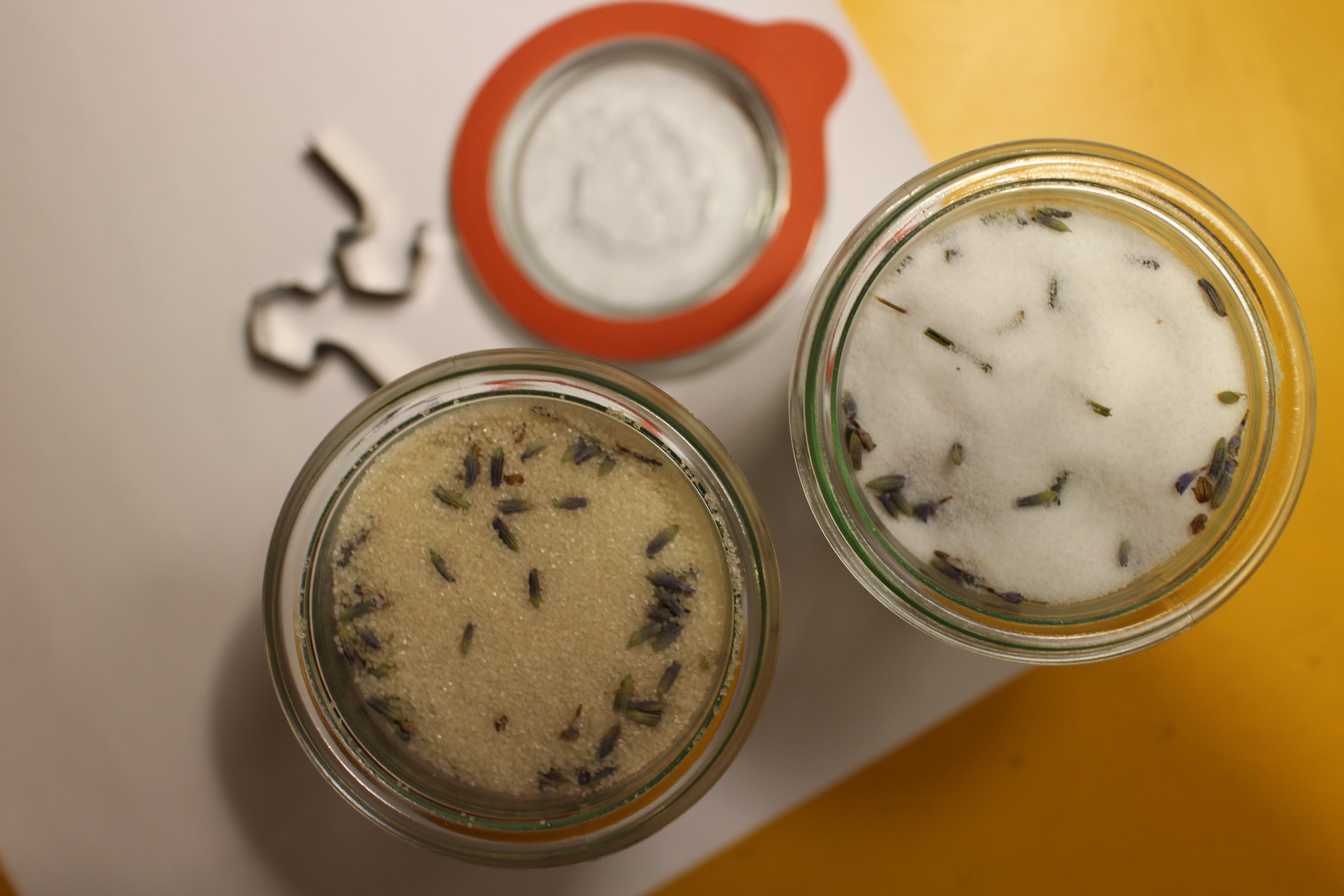 Last year, I was very interested in coarse salt seasoned with fennel pollen and dried orange peel. This year, I added dried organic lavender flowers to organic cane sugar and sea salt, all of which are available in bulk from our local organic market. I could have used the lavender that I harvested last summer from our CSA but it looked a little dusty. The proportions are approximate, but to avoid an overdose of lavender that might leave a bitter taste, I used a scant teaspoon of lavender buds to 2/3 cup (2 ounces) of sugar or salt. Unlike vanilla, which takes a while to infuse, this is ready in a matter of days. I use the sugar in syrup, sprinkled on sugar cookies and on poached fruit. Lavender salt will find a similar use, but will probably be used on delicate white fish or scallops.