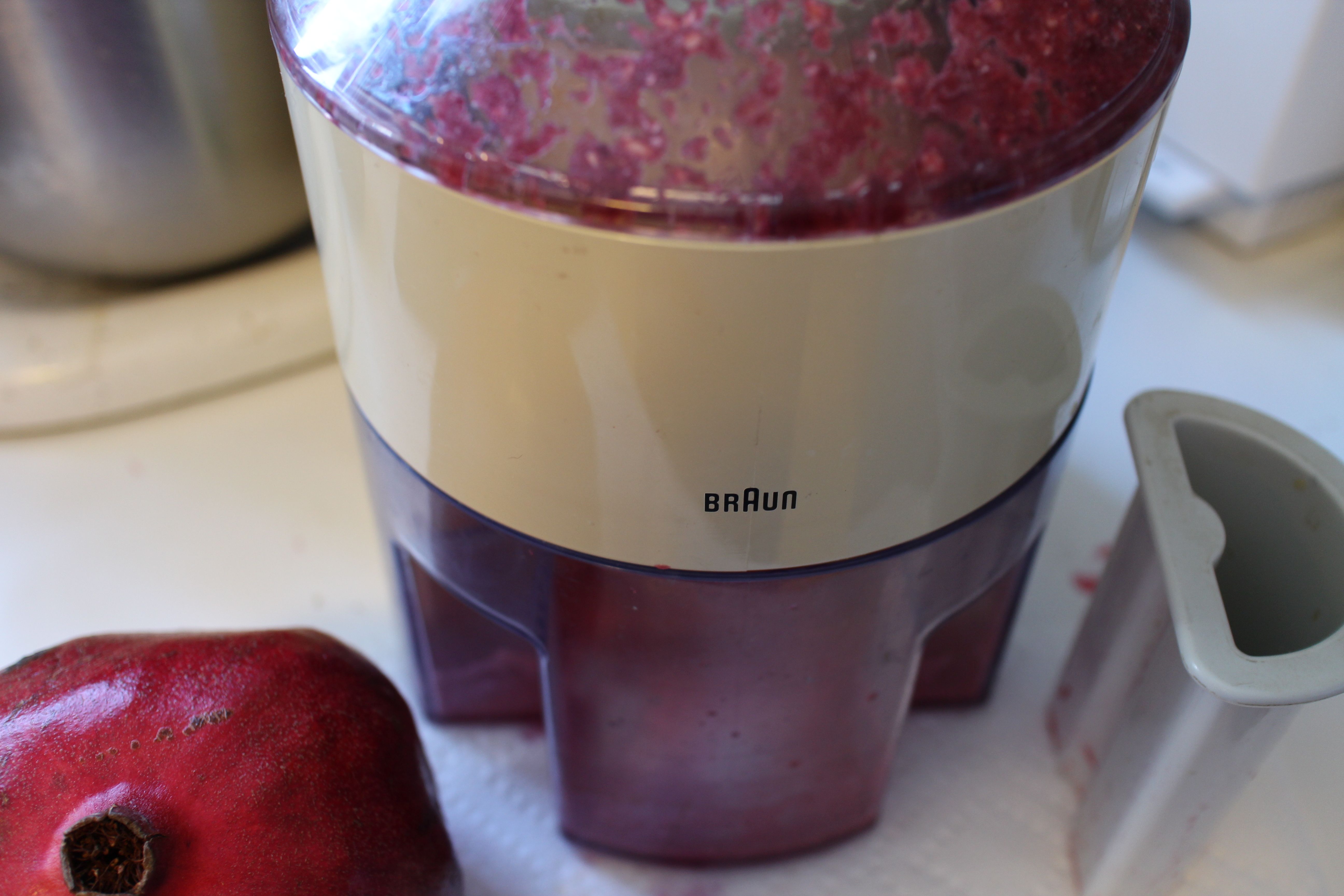 To the rescue came our electric juicer, the type that feeds fruit and vegetables through a tube at the top into a spinning cup with tiny blades that sends the pulp and juice in different directions. The trick for the pomegranate seeds was putting them into a narrow juice glass so that I could feed them into the tube without sending the juicy jewels all over the counter and floor. It worked perfectly and in no time, I had plenty of seedless juice.