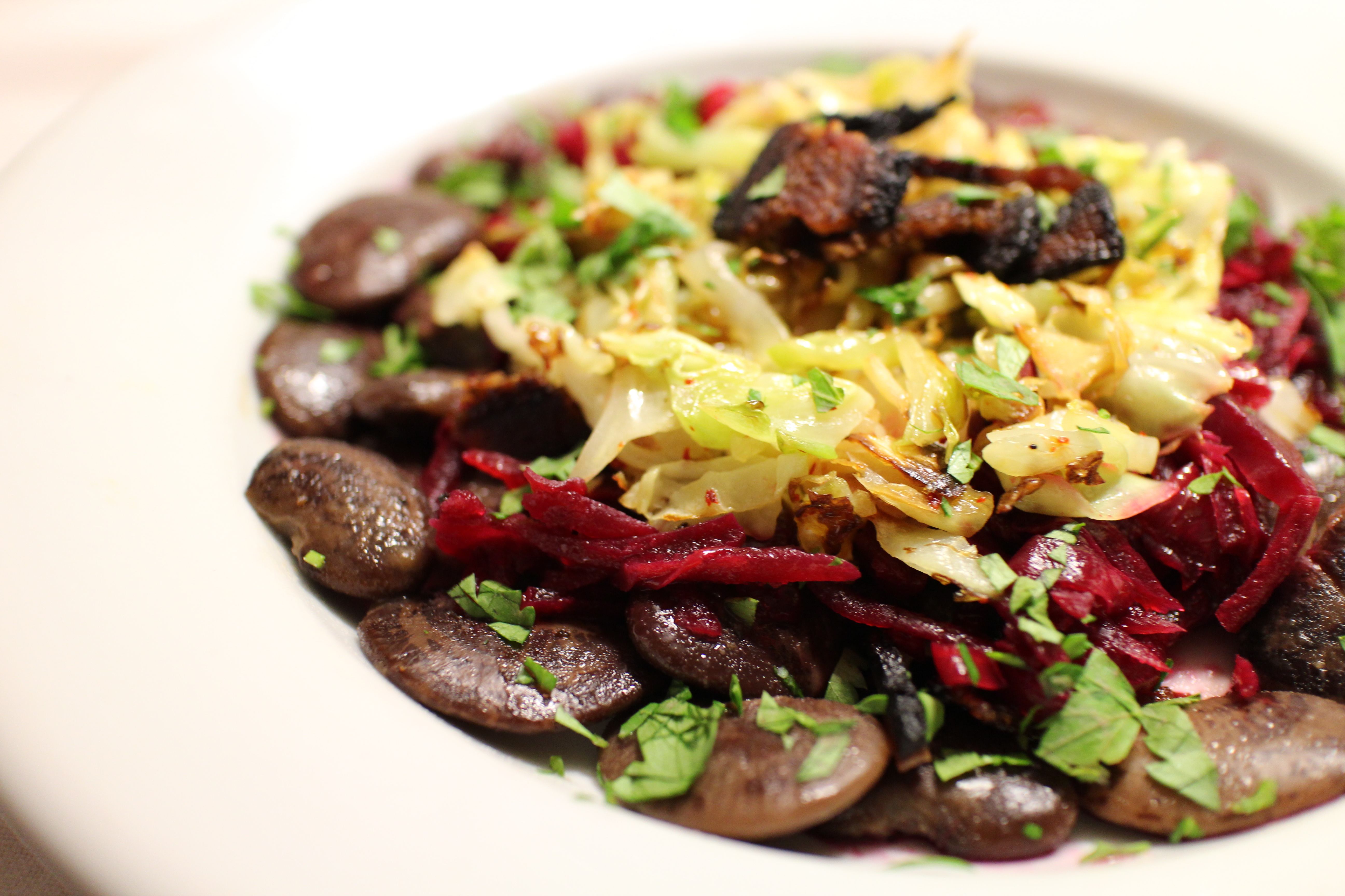 Sauté the shredded cabbage in butter or oil over medium-high heat until it is lightly brown and wilted but still crunchy. Add it to the beet mixture with the red vine vinegar. Season aggressively with salt and pepper (it might need quite a bit of salt). Add more liquid if needed, preferably stock but water would be fine. Simmer for a few minutes to let the flavors blend.